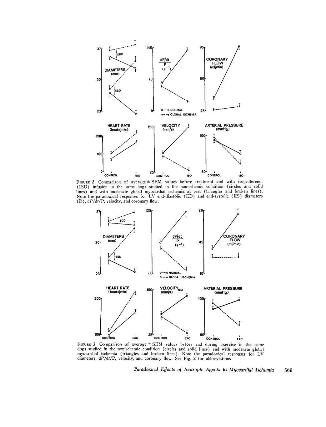 The effects of isoproterenol, norepinephrine, dobutamine, exercise, and nitroglycerin on left ventricular diameter, pressure, velocity of shortening, dP/dt, dP/dt/P, arterial pressure, left circumflex coronary blood flow, and coronary vascular resistance were examined in healthy conscious dogs with normal coronary perfusion and in the same animals after moderate global ischemia had been induced by partial occlusion of the left main coronary artery. In the normal nonischemic heart, all interventions improved left ventricular performance, as evidenced by increases in dP/dt/P and velocity at the same or lower left ventricular end-diastolic diameter. Interventions, which in the normal heart caused large increases in heart rate and myocardial contractility, e.g. isoproterenol and exercise, or which decreased coronary perfusion pressure, e.g. nitroglycerin or isoproterenol, elicited paradoxical responses in moderate global ischemia, i.e., left ventricular enddiastolic diameter and pressure rose, and dP/dt/P and velocity fell substantially. On the other hand, norepinephrine, which increased coronary perfusion pressure along with myocardial contractility but did not increase heart rate, improved left ventricular function. Dobutamine, which did not alter heart rate or arterial pressure substantially while improving myocardial contractility, produced an intermediate response between that of norepinephrine and isoproterenol in the presence of moderate global myocardial ischemia. Thus, interventions that increase myocardial O2 requirements, by increasing heart rate and myocardial contractility without augmenting coronary perfusion pressure, can produce a paradoxical depression of ventricular function in the presence of global myocardial ischemia.