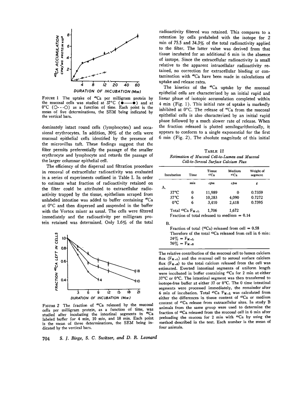 The uptake and release of 45Ca from the intestinal mucosal epithelium were investigated under a variety of conditions. The initial rate of uptake characterized a calcium pool with a half-time of saturation of less than 2 min. The entry of 45Ca into this pool was inhibited by NaCN and ethacrynic acid and was stimulated by the removal of Cl- from the incubation. The initial rate of 45Ca release was also inhibited by NaCN and removal of Na+ from the incubation. Parathyroid hormone administration enhanced the release of 45Ca from cells prepared from parathyroid-ectomized animals. These observations suggest that calcium transport across the brush border and basallateral membranes are identifiable components of the kinetics of 45Ca uptake and release and that parathyroid hormone stimulates a sodium-dependent mechanism of calcium transport across the basal-lateral membranes.