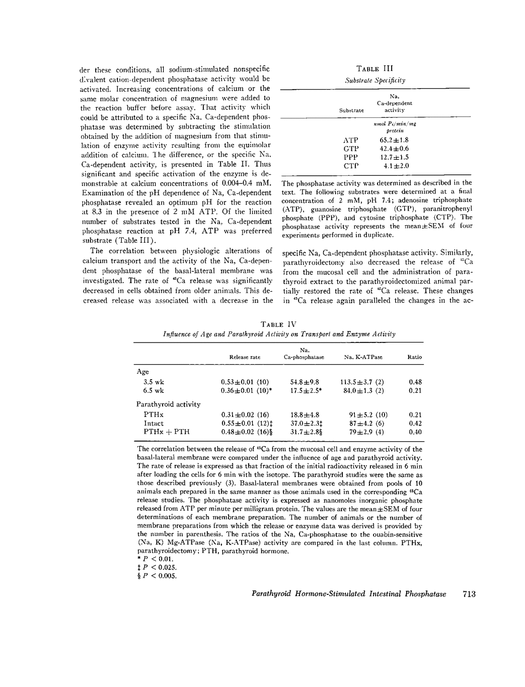 Previous reports suggest that the site of the energy-dependent intestinal calcium transport against an electropotential and concentration gradient is located along the basal-lateral membrane of the mucosal cell. Accordingly, basal-lateral membranes were prepared from rat intestinal homogenates in order to identify the enzyme mediating this step in the transport process. An alkaline phosphatase was delineated which utilized ATP as a substrate and was dependent on both Na- and Ca++ with optimum enzyme activity at 200 mM and 0.04 mM, respectively. Furthermore, the activity of the enzyme was demonstrated to decrease with the advance in age of the animal and to decrease with removal of the parathyroid glands, consistent with a decreased rate of 45Ca release from mucosal cells under the same experimental conditions. Calcium binding to basal-lateral membrane fragments was also sodium dependent and enhanced by the prior administration of parathyroid extract. The consistent correlation between the rate of calcium transport across the basal-lateral membrane of the mucosal cell and the activity of this Na, Ca-dependent phosphatase under a variety of experimental conditions suggest that this enzyme may mediate the parathyroid hormone-sensitive active transport of calcium across the intestine.