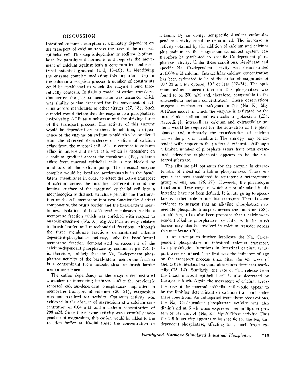 Previous reports suggest that the site of the energy-dependent intestinal calcium transport against an electropotential and concentration gradient is located along the basal-lateral membrane of the mucosal cell. Accordingly, basal-lateral membranes were prepared from rat intestinal homogenates in order to identify the enzyme mediating this step in the transport process. An alkaline phosphatase was delineated which utilized ATP as a substrate and was dependent on both Na- and Ca++ with optimum enzyme activity at 200 mM and 0.04 mM, respectively. Furthermore, the activity of the enzyme was demonstrated to decrease with the advance in age of the animal and to decrease with removal of the parathyroid glands, consistent with a decreased rate of 45Ca release from mucosal cells under the same experimental conditions. Calcium binding to basal-lateral membrane fragments was also sodium dependent and enhanced by the prior administration of parathyroid extract. The consistent correlation between the rate of calcium transport across the basal-lateral membrane of the mucosal cell and the activity of this Na, Ca-dependent phosphatase under a variety of experimental conditions suggest that this enzyme may mediate the parathyroid hormone-sensitive active transport of calcium across the intestine.