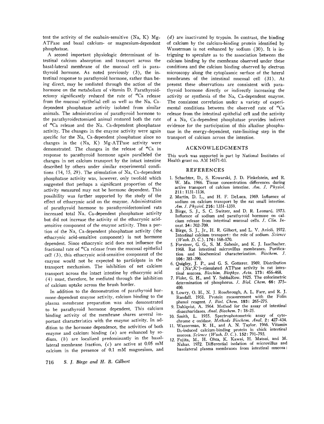 Previous reports suggest that the site of the energy-dependent intestinal calcium transport against an electropotential and concentration gradient is located along the basal-lateral membrane of the mucosal cell. Accordingly, basal-lateral membranes were prepared from rat intestinal homogenates in order to identify the enzyme mediating this step in the transport process. An alkaline phosphatase was delineated which utilized ATP as a substrate and was dependent on both Na- and Ca++ with optimum enzyme activity at 200 mM and 0.04 mM, respectively. Furthermore, the activity of the enzyme was demonstrated to decrease with the advance in age of the animal and to decrease with removal of the parathyroid glands, consistent with a decreased rate of 45Ca release from mucosal cells under the same experimental conditions. Calcium binding to basal-lateral membrane fragments was also sodium dependent and enhanced by the prior administration of parathyroid extract. The consistent correlation between the rate of calcium transport across the basal-lateral membrane of the mucosal cell and the activity of this Na, Ca-dependent phosphatase under a variety of experimental conditions suggest that this enzyme may mediate the parathyroid hormone-sensitive active transport of calcium across the intestine.