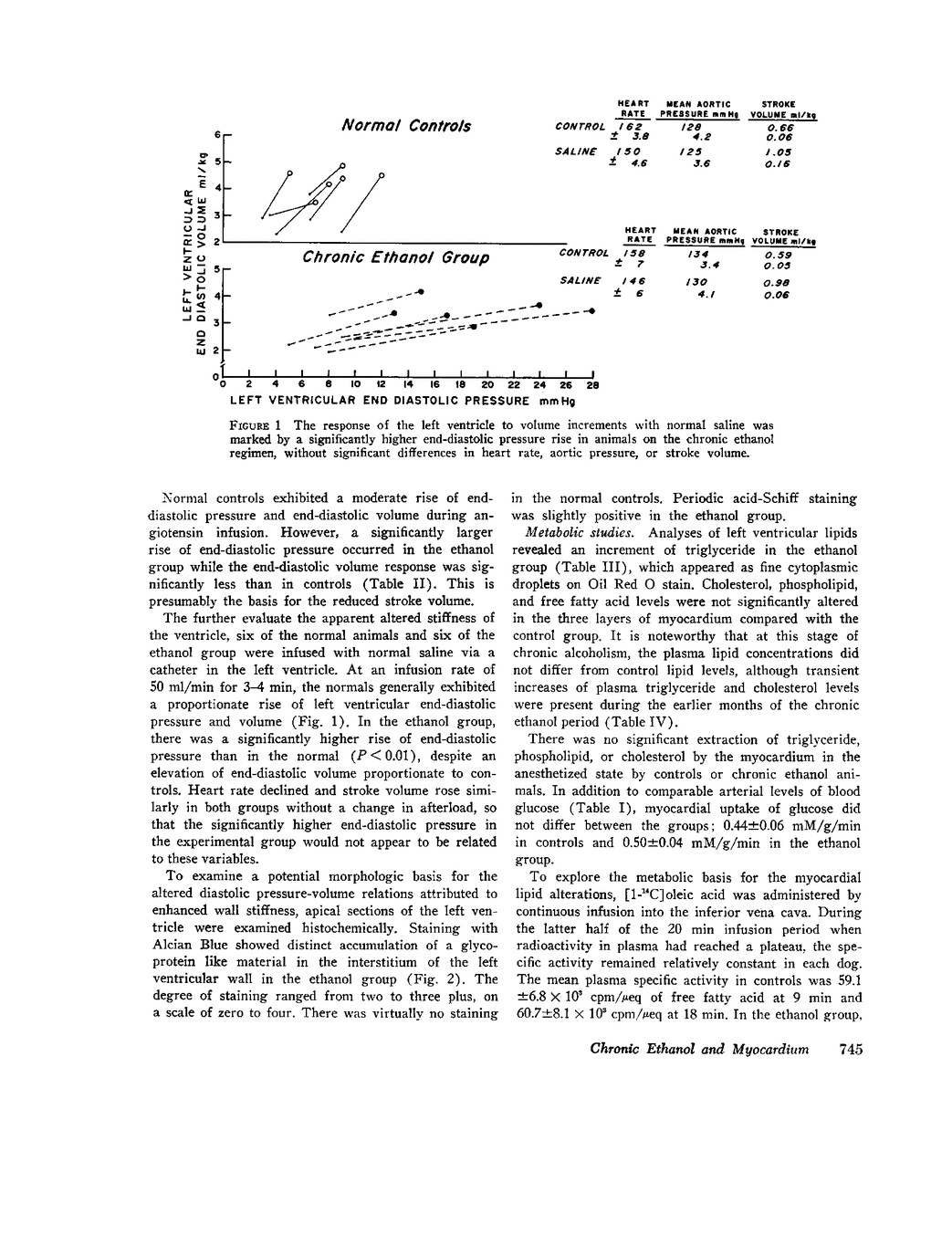In view of the variables that obscure the pathogenesis of cardiomyopathy, a study was undertaken in mongrel dogs fed ethanol as 36% of calories for up to 22 mo. Both the experimental and control groups maintained body weight, hematocrit, plasma vitamin, and protein levels. Left ventricular function was evaluated in the intact anesthetized dog using indicator dilution for end-diastolic and stroke volume determinations. During increased afterload with angiotensin, the ethanol group exhibited a larger rise of end-diastolic pressure (P<0.01), whereas end-diastolic and stroke volume responses were significantly less than in controls. Preload increments with saline elicited a significantly higher end-diastolic pressure rise in the ethanol group (P<0.01). No hypertrophy, inflammation, or fibrosis was present and it was postulated that the enhanced diastolic stiffness was related to accumulation of Alcian Blue-positive material in the ventricular interstitium.