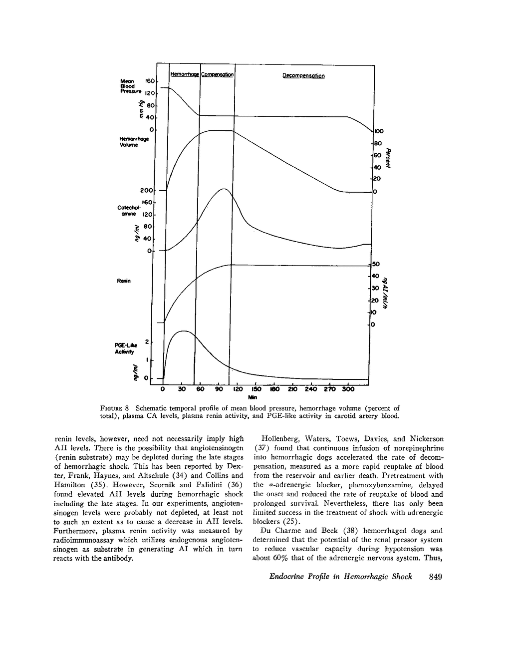 (a) Hemorrhage in dogs (to 45-50 mm Hg) was associated with a 10-fold increase in plasma renin activity (PRA) which remained elevated throughout the time-course of shock including the irreversible (decompensation) stage. The presence of angiotensin II (AII) in arterial blood was demonstrated by the bloodbathed organ technique and confirmed by blockade with specific AII antagonists (cysteine8-AII or isoleucine8-AII). The contribution of AII to systemic peripheral resistance during hemorrhage shock in dogs was established by administering AII antagonists which immediately cause a further fall in blood pressure.