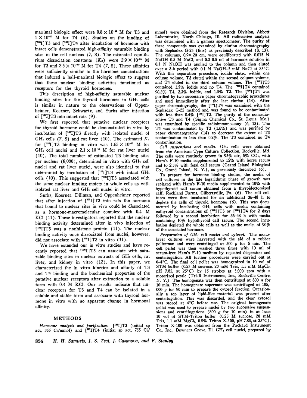 We previously reported that putative nuclear receptors for thyroid hormone can be demonstrated by incubation of hormone either with intact GH1 cells, a rat pituitary tumor cell line, or with isolated GH1 cell nuclei and rat liver nuclei in vitro.