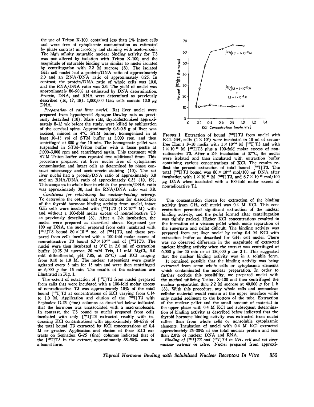 We previously reported that putative nuclear receptors for thyroid hormone can be demonstrated by incubation of hormone either with intact GH1 cells, a rat pituitary tumor cell line, or with isolated GH1 cell nuclei and rat liver nuclei in vitro.