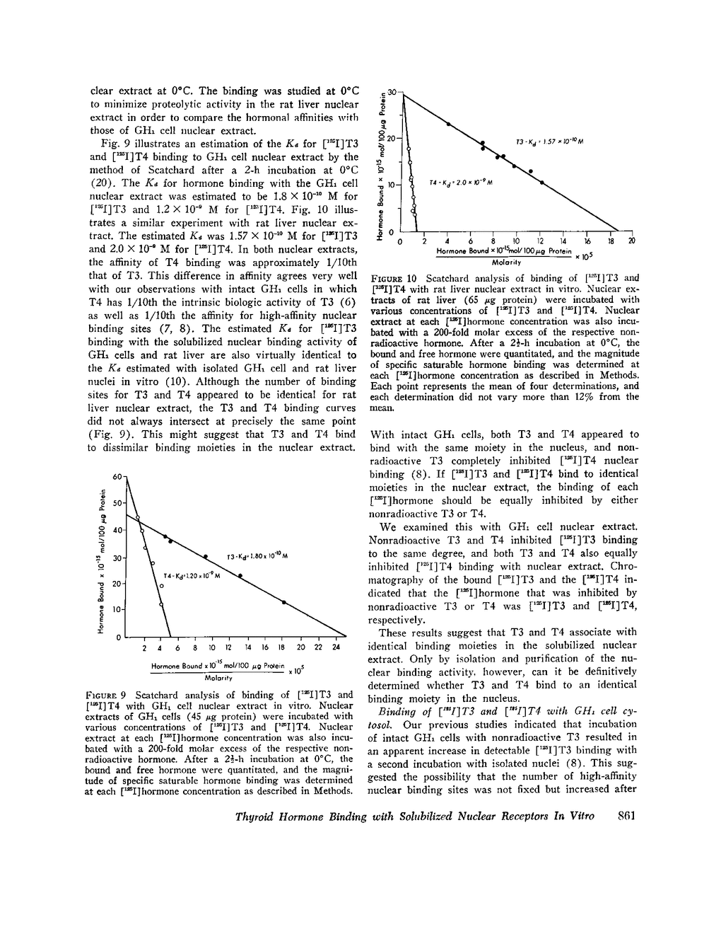 We previously reported that putative nuclear receptors for thyroid hormone can be demonstrated by incubation of hormone either with intact GH1 cells, a rat pituitary tumor cell line, or with isolated GH1 cell nuclei and rat liver nuclei in vitro.