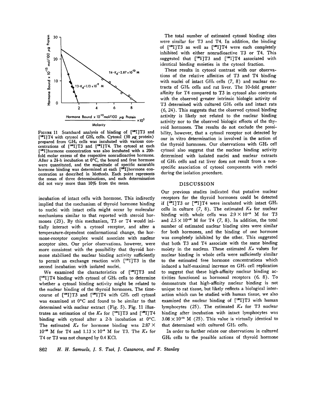We previously reported that putative nuclear receptors for thyroid hormone can be demonstrated by incubation of hormone either with intact GH1 cells, a rat pituitary tumor cell line, or with isolated GH1 cell nuclei and rat liver nuclei in vitro.