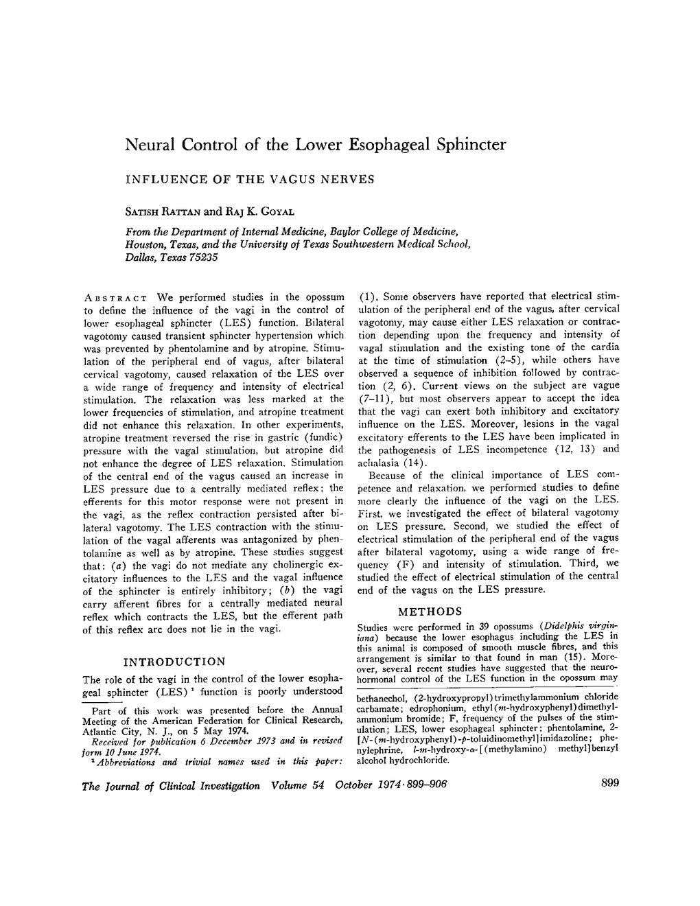 We performed studies in the opossum to define the influence of the vagi in the control of lower esophageal sphincter (LES) function. Bilateral vagotomy caused transient sphincter hypertension which was prevented by phentolamine and by atropine. Stimulation of the peripheral end of vagus, after bilateral cervical vagotomy, caused relaxation of the LES over a wide range of frequency and intensity of electrical stimulation. The relaxation was less marked at the lower frequencies of stimulation, and atropine treatment did not enhance this relaxation. In other experiments, atropine treatment reversed the rise in gastric (fundic) pressure with the vagal stimulation, but atropine did not enhance the degree of LES relaxation. Stimulation of the central end of the vagus caused an increase in LES pressure due to a centrally mediated reflex; the efferents for this motor response were not present in the vagi, as the reflex contraction persisted after bilateral vagotomy. The LES contraction with the stimulation of the vagal afferents was antagonized by phentolamine as well as by atropine. These studies suggest that: (a) the vagi do not mediate any cholinergic excitatory influences to the LES and the vagal influence of the sphincter is entirely inhibitory; (b) the vagi carry afferent fibres for a centrally mediated neural reflex which contracts the LES, but the efferent path of this reflex arc does not lie in the vagi.