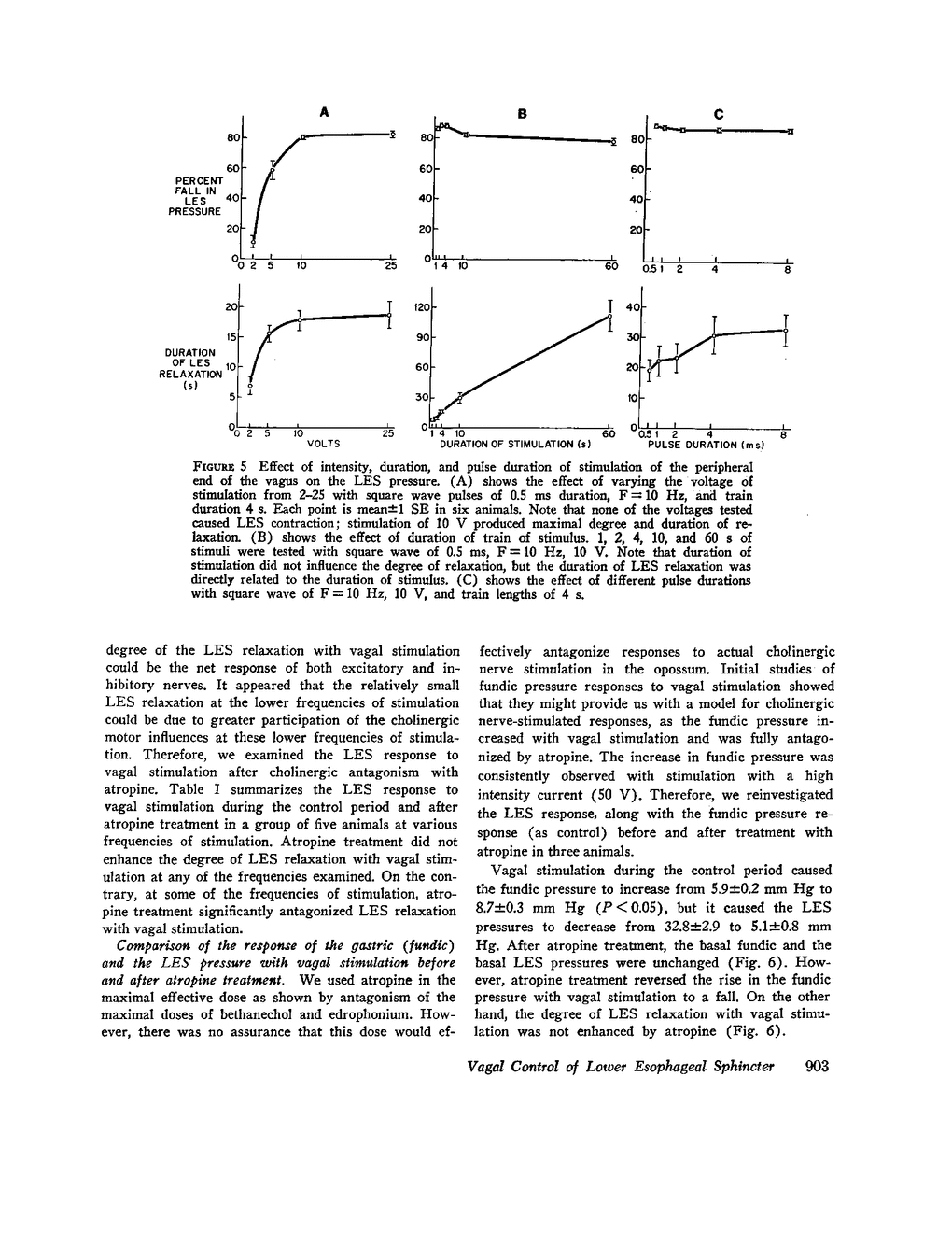 We performed studies in the opossum to define the influence of the vagi in the control of lower esophageal sphincter (LES) function. Bilateral vagotomy caused transient sphincter hypertension which was prevented by phentolamine and by atropine. Stimulation of the peripheral end of vagus, after bilateral cervical vagotomy, caused relaxation of the LES over a wide range of frequency and intensity of electrical stimulation. The relaxation was less marked at the lower frequencies of stimulation, and atropine treatment did not enhance this relaxation. In other experiments, atropine treatment reversed the rise in gastric (fundic) pressure with the vagal stimulation, but atropine did not enhance the degree of LES relaxation. Stimulation of the central end of the vagus caused an increase in LES pressure due to a centrally mediated reflex; the efferents for this motor response were not present in the vagi, as the reflex contraction persisted after bilateral vagotomy. The LES contraction with the stimulation of the vagal afferents was antagonized by phentolamine as well as by atropine. These studies suggest that: (a) the vagi do not mediate any cholinergic excitatory influences to the LES and the vagal influence of the sphincter is entirely inhibitory; (b) the vagi carry afferent fibres for a centrally mediated neural reflex which contracts the LES, but the efferent path of this reflex arc does not lie in the vagi.