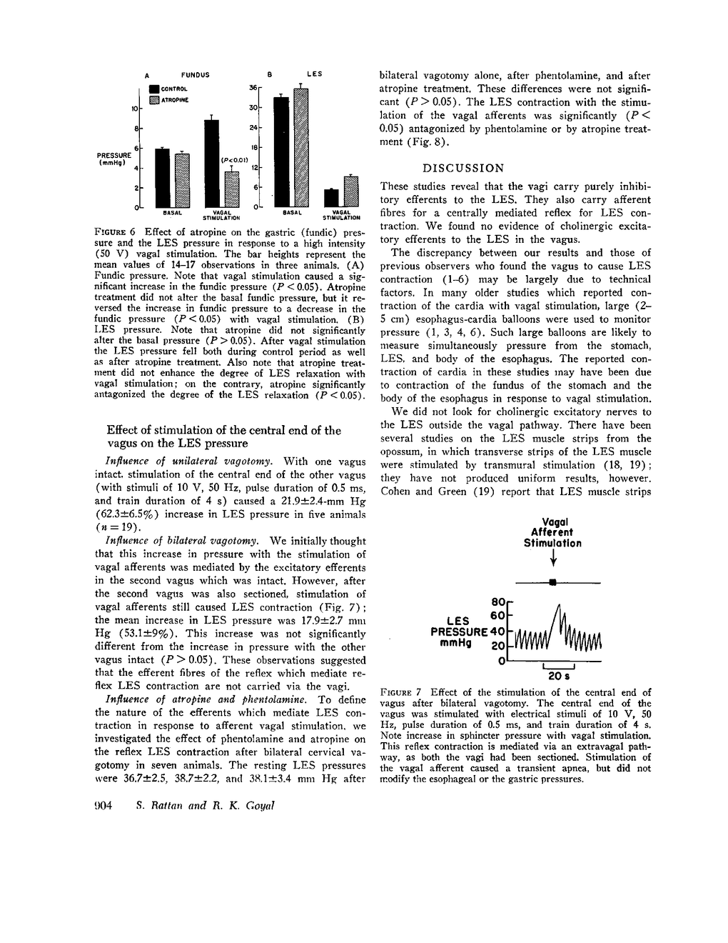 We performed studies in the opossum to define the influence of the vagi in the control of lower esophageal sphincter (LES) function. Bilateral vagotomy caused transient sphincter hypertension which was prevented by phentolamine and by atropine. Stimulation of the peripheral end of vagus, after bilateral cervical vagotomy, caused relaxation of the LES over a wide range of frequency and intensity of electrical stimulation. The relaxation was less marked at the lower frequencies of stimulation, and atropine treatment did not enhance this relaxation. In other experiments, atropine treatment reversed the rise in gastric (fundic) pressure with the vagal stimulation, but atropine did not enhance the degree of LES relaxation. Stimulation of the central end of the vagus caused an increase in LES pressure due to a centrally mediated reflex; the efferents for this motor response were not present in the vagi, as the reflex contraction persisted after bilateral vagotomy. The LES contraction with the stimulation of the vagal afferents was antagonized by phentolamine as well as by atropine. These studies suggest that: (a) the vagi do not mediate any cholinergic excitatory influences to the LES and the vagal influence of the sphincter is entirely inhibitory; (b) the vagi carry afferent fibres for a centrally mediated neural reflex which contracts the LES, but the efferent path of this reflex arc does not lie in the vagi.