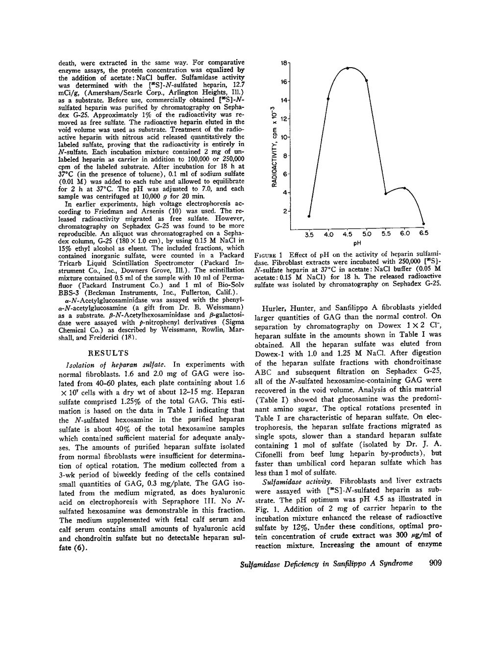 The Sanfilippo A syndrome is an autosomal recessive mucopolysaccharidosis characterized clinically by severe mental retardation and biochemically by storage in tissue and excretion in urine of excessive amounts of heparan sulfate. Since sulfamide groups are present in heparan sulfate, a sulfamidase deficiency could explain the impaired degradation of this polysaccharide. To investigate the enzymic basis of this disease, assays for sulfamidase were performed. Extracts of cultured fibroblasts and post-mortem liver were prepared by suspension of tissues in acetate: NaCl buffer, pH 4.5, containing Triton X-100 (Rohm and Haas Co., Philadelphia, Pa.), sonication, and centrifugation at 10,000 g. The supernatant fluid was incubated with [35S]-N-sulfated heparin. The release of inorganic sulfate after 18 h of incubation was determined by chromatography on Sephadex G-25. The liver and fibroblast extracts of patients with the Sanfilippo A syndrome showed a deficiency of sulfamidase.