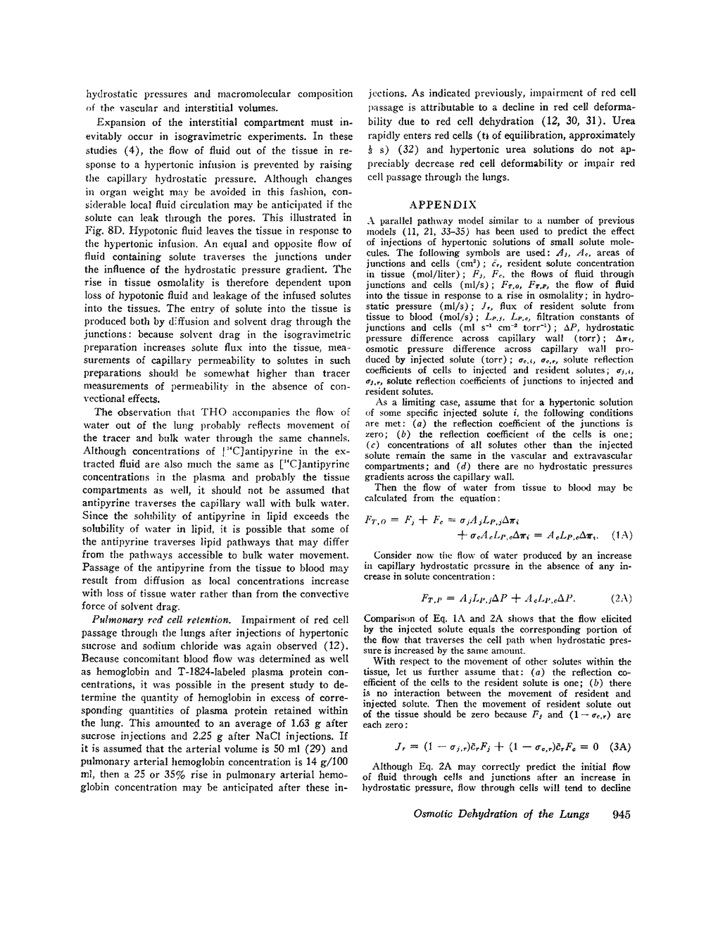 After injections of sucrose, NaCl, and urea solutions, the flow of tissue fluid from the lungs amounted to 0.182, 0.216, and 0.152 × 10-3 ml/s per mosmol/kg of concentration difference between plasma and tissues in each gram of wet tissue weight. The extracted fluid contained less than 20% of the Na+, K+ and urea concentrations of the plasma. It was concluded that this fluid was distinctly hypotonic in comparision with the fluids of the plasma and tissue compartments both before and after the injection of hypertonic solutions.