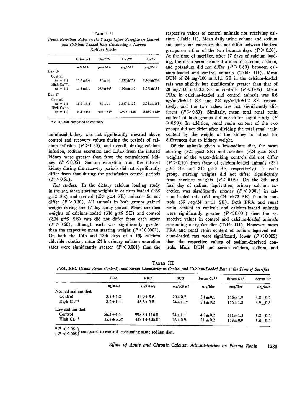 To evaluate the effect of Ca++ on renin release, plasma renin activity (PRA) was measured after acute and chronic Ca++ administration. 1% CaCl2 was infused into one renal artery of 10 anesthetized dogs (0.3 mg/kg/min). The excreted fraction of filtered calcium (EFca++) and EFNa+ from the infused kidney were elevated (P < 0.04) during three successive 15-min infusion periods. Serum calcium concentration was significantly elevated (P < 0.001). Creatinine clearance, systemic arterial pressure, and renal blood flow did not change (P > 0.10). Compared to control (45 ng/ml/h±5.2 SE), renal venous PRA was suppressed (P < 0.0001) after infusion of Ca++ for 15, 30, and 45 min (20 ng/ml/h±4.6, 16 ng/ml/h±4.0, and 13 ng/ml/h±2.7, respectively). 15 and 30-min after infusion, PRA did not differ from control (P > 0.20). Chronic Ca++ loading was achieved in Sprague-Dawley rats by replacing drinking water with 1% CaCl2 for 17 days. At sacrifice, serum Ca++, Na+, and K+ of controls (n = 12) did not differ (P > 0.60) from Ca++-loaded rats (n = 12). Ca++ excretion (467 μeq/24 h±51) was elevated (P < 0.001) compared to controls (85 μeq/24 h±12). PRA (8.6 ng/ml/h±1.4) and renal renin content of Ca++-loaded rats did not differ from controls (P > 0.80). However, after 8 days of sodium deprivation, both PRA and renal renin content of calcium-loaded animals were significantly lower than the respective values in pair-fed controls (P < 0.005). During the period of sodium deprivation, calcium-drinking animals were in greater negative sodium balance than controls (P < 0.005). The data are consistent with the hypothesis that acute and chronic calcium administration inhibit renin secretion.