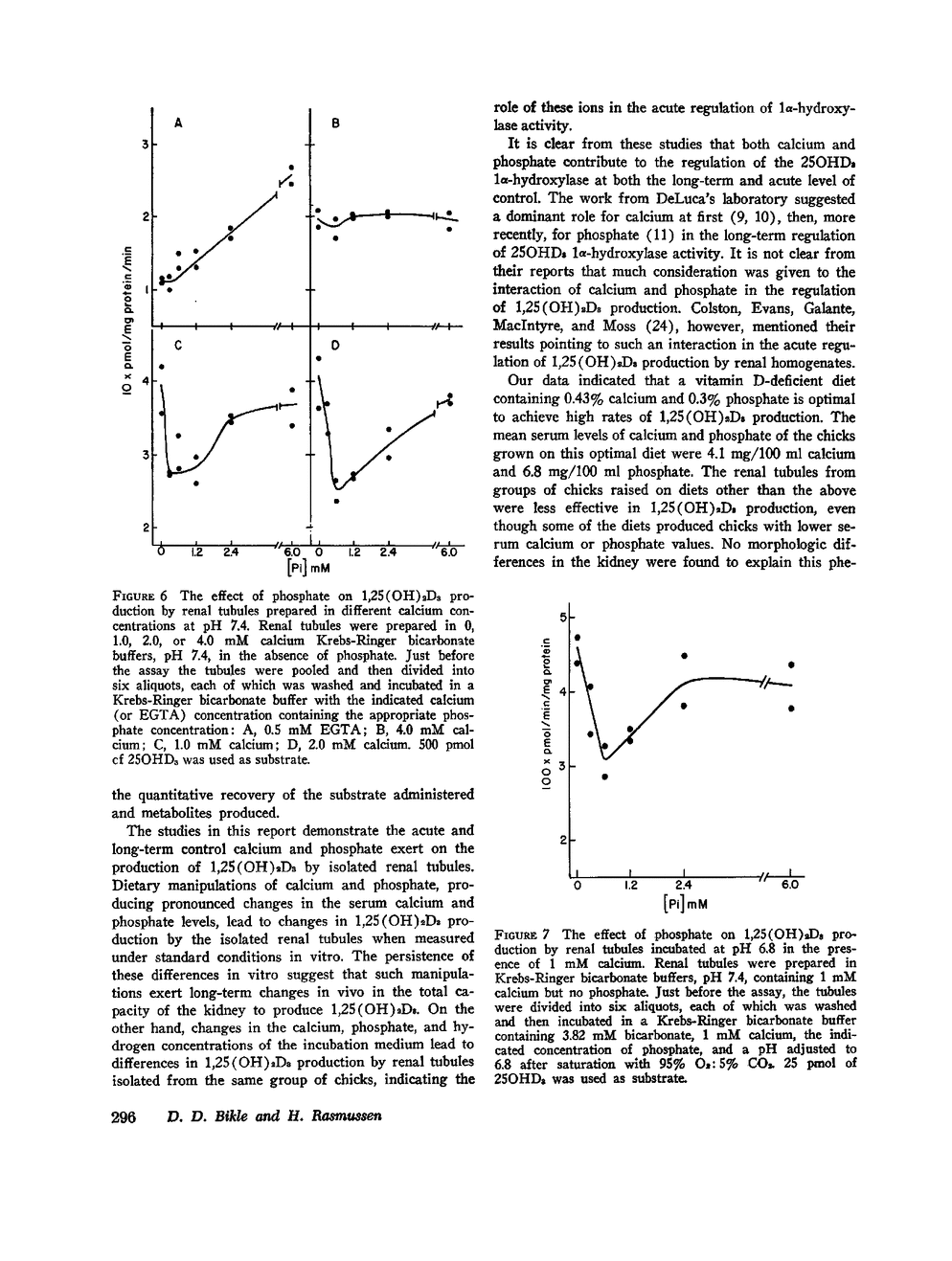 Isolated renal tubules prepared from vitamin D-deficient chicks catalyze the 1 alpha-hydroxylation of 25-hydroxyvitamin D3 (250HD3) in vitro. The effect of calcium and phosphate on the rate of synthesis of the product, 1, 25-dihydroxyvitamin D3 (1,25(OH)2D3), was studied at two levels: the long-term effects of various dietary calcium and phosphate contents on the ability of the tubules to produce 1, 25 (OH)2D3, and the acute effects of different calcium and phosphate concentrations in the incubation medium on the rate of synthesis of 1,25(OH)2D3 by the tubules. Manipulation of dietary calcium and phosphate sufficient to produce marked changes in the concentration of calcium and phosphate in the serum led to altered rates of 1,25(OH)2D3 synthesis by the isolated renal tubules. The renal tubules isolated from chicks raised on a vitamin D-deficient diet containing 0.43% calcium and 0.3% P as inorganic phosphate showed the highest rate of synthesis of 1,25(OH)2D3. Diets containing more or less of either calcium or phosphate produced chicks whose renal tubules had a slower rate of 1,25(OH)2D3 production. The calcium, phosphate, and hydrogen ion content of the incubation medium were manipulated to determine the possible factors concerned with the immediate regulation of 1,25(OH)2D3 production. A calcium concentration of 0.5-1.0 mM was necessary for optimal enzymatic activity. Concentrations of calcium greater than this optimal concentration inhibited 1,25(OH)2D3 production if phosphate was also present, and this inhibition was more pronounced as the phosphate concentration was increased. The stimulation of 1,25(OH)2D3 production by calcium was less at pH 6.7 than at 7.4. Raising the phosphate concentration from 0 to 6 mM in the absence of calcium also stimulated the rate of synthesis of 1,25(OH)2D3. This stimulatory effect was blocked by 4 mM calcium. However, at 1-2 mM calciu, phosphate had a biphasic influence on 1,25(OH)2D3 production; extracellular concentrations of phosphate from 0.6 to 1.2 mM resulted in less 1,25(OH)2D3 production than higher or lower phosphate concentrations. This biphasic effect was seen both at pH 7.4 and 6.8.