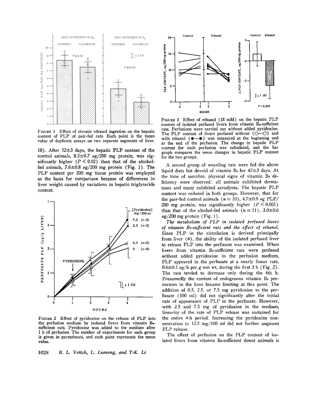 Individuals with chronic alcohol abuse frequently exhibit lowered plasma levels of pyridoxal 5'-phosphate, the coenzyme form of vitamin B6. Because the liver is the primary source of this coenzyme in plasma and also the principal organ that oxidizes ethanol, the effect of ethanol on hepatic pyridoxal phosphate metabolism was studied in the rat. The chronic feeding of ethanol (36 percent of the total dietary calories) for 6 wk significantly decreased the hepatic pyridoxal phosphate content both in animals given a sufficient amount of vitamin B6 in their diet and in those rendered vitamin B6 deficient. In isolated perfused livers, the addition of 18 mM ethanol lowered the pyridoxal phosphate content of livers from vitamin B6-sufficient animals and deceased the net synthesis of pyridoxal phosphate from pyridoxine by the livers of vitamin B6-deficient animals. Ethanol also diminished the rate of release of pyridoxal phosphate into the perfusate by the livers of vitamin B6-deficient rats. These effects of ethanol, in vitro, were abolished by 4-methyl pyrazole, an inhibitor of alcohol dehydrogenase. Thus the derangement of pyridoxal phosphate metabolism produced by ethanol is dependt upon its oxidation. These data support previous findings whic indicate that acetaldehyde is the responsible agent which acts by accelerating the degradation of intracellular pyridoxal phosphate.