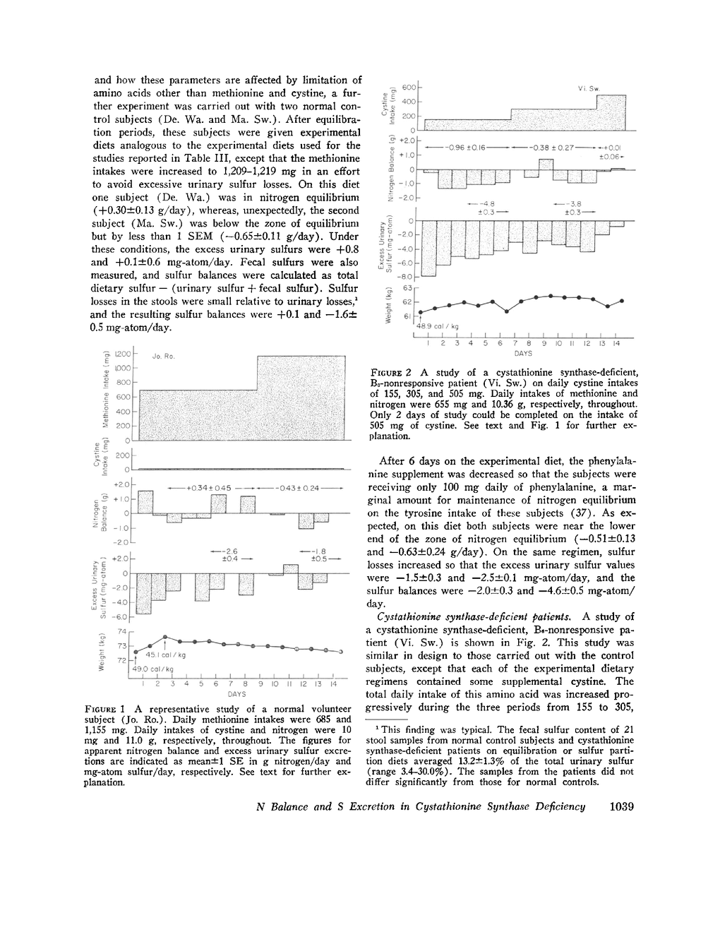 Apparent nitrogen balances and urinary sulfur excretions were determined for normal subjects, seven cystathionine synthase-deficient patients, and a single cystathioninuric patient on semisynthetic diets containing low-adequate amounts of methionine and very low amounts of methionine and very low amounts (12 mg daily, or less) of cystine. The amounts of supplemental cystine required to prevent abnormally high nitrogen or sulfur losses were determined. The five cystathionine synthase-deficient patients who had low residual activities of this enzyme detected in fibroblast and/or liver extracts did not lose more nitrogen or sulfur on diets virtually devoid of cystine than did the normal subjects. These results suggest that the widely expressed opinion that cystine is an essential amino acid for cystathionine syntase-deficient patients requires modification. Residual enzyme activity of only a few percent of normal may obviate such a cystine requirement. These results are compatible with, and lend support to, the working hypothesis which states that the pyridoxine response in cystathionine synthase-deficient patients is mediated by an increase in the residual activity of the affected enzyme.