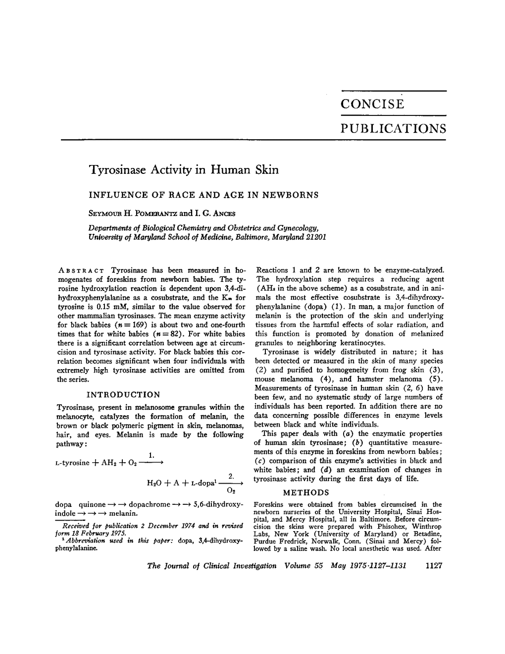 Tyrosinase has been measured in homogenates of foreskins from newborn babies. The tyrosine hydroxylation reaction is dependent upon 3,4-dihydroxyphenylalanine as a cosubstrate, and the Km for tyrosine is 0.15 mM, similar to the value observed for other mammalian tyrosinases. The mean enzyme activity for black babies (n = 169) is about two and one-fourth times that for white babies (n = 82). For white babies there is a significant correlation between age at circumcision and tyrosinase activity. For black babies this correlation becomes significant when four individuals with extremely high tyrosinase activities are omitted from the series.