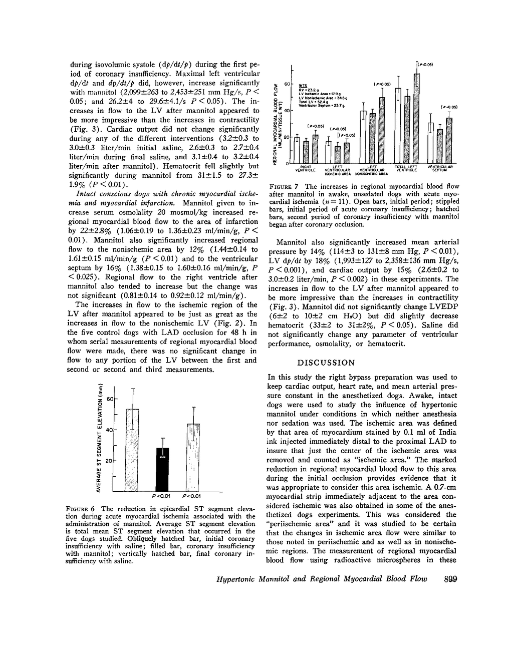 The influence of hypertonic mannitol on regional myocardial blood flow and ventricular performance was studied during acute myocardial ischemia in awake, unsedated and in anesthesized dogs and after myocardial infarction in awake unsedated dogs. Regional myocardial blood flow was measured with radioactive microspheres. Generalized increases in regional myocardial blood flow occurred after mannitol in all of the different animal models studied. The increases in coronary blood flow after mannitol were just as impressive in the nonischemic regions as in the ischemic portion of the left ventricle in all of the different models that were examined in this study. Improvement in regional myocardial blood flow to the ischemic area of the left ventricle after mannitol was associated with a reduction in ST segment elevation during acute myocardial ischemia in anesthetized dogs. The increases in regional myocardial flow after mannitol were also associated with increases in contractility, but the increases in flow appeared to be more impressive than the changes in contractility. The data obtained demonstrate that mannitol increases regional coronary blood flow to both ischemic and nonischemic myocardium in both anesthetized and awake, unsedated, intact dogs with acute and chronic myocardial ischemia and that mannitol reduces ST segment elevation during acute myocardial ischemia in anesthetized dogs. Thus the results suggest that under these circumstances the increases in regional myocardial blood flow after mannitol are of physiological importance in reducing the extent of myocardial injury. Since coronary blood flow increased to nonischemic regions the increases in regional myocardial flow demonstrated in this study after mannitol cannot be entirely explained by the mechanism of reduction in ischemic cell swelling.