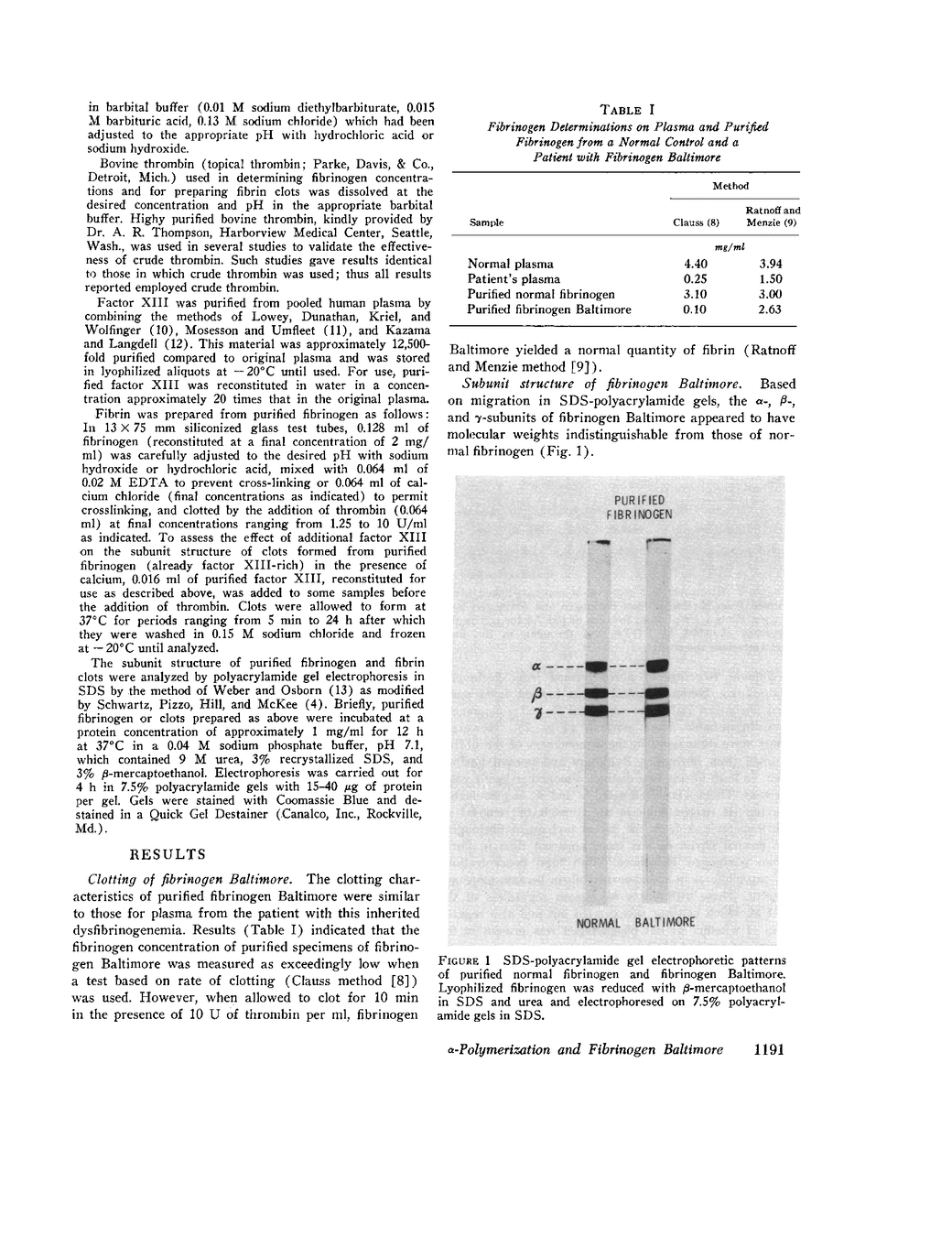 The subunit structure of fibrinogen Baltimore and fibrin formed from this inherited dysfibrinogenemia was analyzed by polyacrylamide gel electrophoresis in sodium dodecyl sulfate. The molecular weights of the alpha-, b- and gamma-chains of fibrinogen Baltimore were found to be identical to those of normal fibrinogen. Noncross-linked fibrin formed from both purified fibrinogen Baltimore as well as normal fibrinogen contained two alpha-monomers (alpha1 and alpha2). alpha2 was presumed to be alpha-monomer from which fibrinopeptide A had been released. The evolution of alpha2 during clotting of fibrinogen Baltimore was delayed and appeared to be quantitatively reduced when compared to normal. Crosslinked fibrin formed from fibrinogen Baltimore possessed an abnormal subunit structure. alpha-polymers were not generated in thrombin-induced, factor XIII-rich clots of fibrinogen Baltimore under conditions of pH and calcium concentration suitable for complete alpha-polymerization in normal fibrin. If clotting was carried out with calcium concentrations twice that required for normal clots or at pH 6.4, fibrin from fibrinogen Baltimore was completely cross-linked. These structural analyses of fibrin formed from fibrinogen Baltimore substantiate earlier findings that indicate a defect in the alpha-chain of this dysfibrinogenemia.