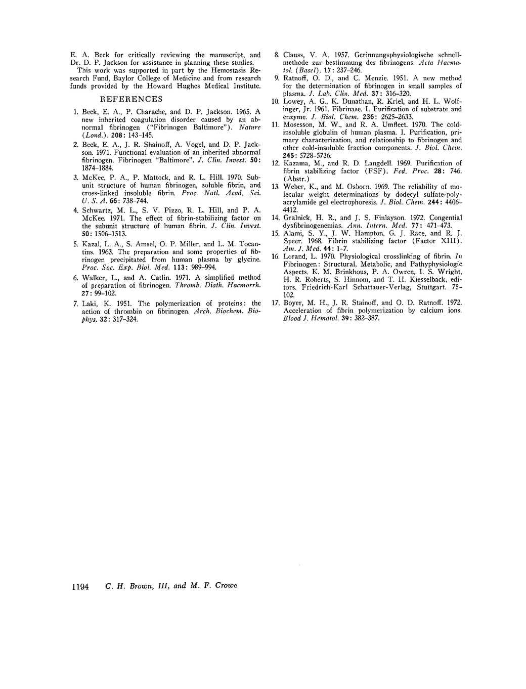 The subunit structure of fibrinogen Baltimore and fibrin formed from this inherited dysfibrinogenemia was analyzed by polyacrylamide gel electrophoresis in sodium dodecyl sulfate. The molecular weights of the alpha-, b- and gamma-chains of fibrinogen Baltimore were found to be identical to those of normal fibrinogen. Noncross-linked fibrin formed from both purified fibrinogen Baltimore as well as normal fibrinogen contained two alpha-monomers (alpha1 and alpha2). alpha2 was presumed to be alpha-monomer from which fibrinopeptide A had been released. The evolution of alpha2 during clotting of fibrinogen Baltimore was delayed and appeared to be quantitatively reduced when compared to normal. Crosslinked fibrin formed from fibrinogen Baltimore possessed an abnormal subunit structure. alpha-polymers were not generated in thrombin-induced, factor XIII-rich clots of fibrinogen Baltimore under conditions of pH and calcium concentration suitable for complete alpha-polymerization in normal fibrin. If clotting was carried out with calcium concentrations twice that required for normal clots or at pH 6.4, fibrin from fibrinogen Baltimore was completely cross-linked. These structural analyses of fibrin formed from fibrinogen Baltimore substantiate earlier findings that indicate a defect in the alpha-chain of this dysfibrinogenemia.