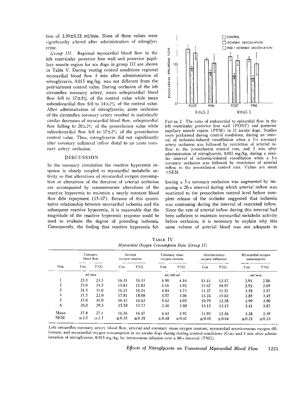 This study was designed to determin the effect of nitroglycerin upon transmural distribution of myocardial blood flow in the awake dog during normal conditions and in the presence of ischemia-induced coronary vasodilation. Studies were performed in chronically prepared dogs with electromagnetic flowmeters and hydraulic occluders on the left circumflex coronary artery. Regional myocardial blood flow was estimated by using radionuclide-labeled microspheres, 7-10 mum in diameter, injected into the left atrium. During control conditions endocardial flow (0.86 plus or minus SEM 0.05 ml/min per g) slightly exceeded epicardial flow (0.72 plus or minus 0.03 ml/min per g, P smaller than 0.05), and this distribution of flow was not significantly altered by nitroglycerin. After a 5-s coronary artery occlusion, reactive hyperemia occurred with excess inflow of arterial blood effecting 360 plus or minus 15% repayment of the blood flow debt incurred during occlusion. When arterial inflow was limited to the preocclusion rate during coronary vasodilation after a 5-s total coronary artery occlusion, flow to the subepicardial myocardium was increased at the expense of underperfusion of the subendocardial myocardium, and the delayed reactive hyperemia was markedly augmented (mean blood flow debt repayment =775plus or minus 105%, P smaller than 0.01). Tese data suggested that subendocardial underperfusion during the interval of coronary vasodilation in the presence of a flow-limiting proximal coronary artery stenosis caused continuing subendocardial ischemia which resulted in augmentation of the reactive hyperemic response. In this experimental model both the redistribution of myocardial blood flow which occurred during an interval of restricted arterial inflow after a 5-s coronary artery occlusion and augmentation of the subsequent reactive hyperemic response were returned toward normal by nitroglycerin. This effect of nitroglycerin may have resulted, at least in part, from its ability to vasodilate the penetrating arteries which deliver blood from the epicardial surface to the subendocardium.