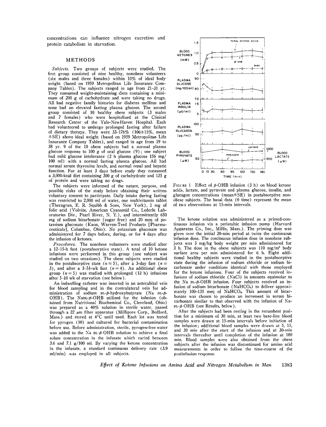 To evaluate the role of hyperketonemia in the hypoalaninemia and decreased protein catabolism of prolonged starvation, Na dl-beta-hydroxybutyrate was administered as a primed continuous 3-6-h infusion in nonobese subjects and in obese subjects in the postabsorptive state and after 3 days and 3-5 1/2 wk of starvation. An additional obese group received 12-h ketone infusions on 2 consecutive days after 5-10 wk of fasting. The ketone infusion in nonobese and obese subjects studied in the postabsorptive state resulted in total blood ketone acid levels of 1.1-1.2 mM, a 5-15 mg/100 ml decrease in plasma glucose, and unchanged levels of insulin, glucagon, lactate, and pyruvate. Plasma alanine fell by 21% (P smaller than 0.001) in 3 h. In contrast, other amino acids were stable or varied by less than 10%. Infusions lasting 6 h reduced plasma alanine by 37%, reaching levels comparable to those observed in prolonged starvation. Equimolar infusions of NaC1 and/or administration of NaHCO3 failed to alter plasma alanine levels. During prolonged fasting, plasma alanine, which had fallen by 40% below prefast levels, fell an additional 30% in response to the ketone infusion. In association with repeated prolonged (12 h) infusions in subjects fasted 5-10 wk, urinary nitrogen excretion fell by 30%, returning to base line after cessation of theinfusions and paralleling the changes in plasma alanine. Ketone infusins resulted in two- to fourfold greater increments in blood ketone acids in fasted as compared to postabsorptive subjects. It is concluded that increased blood ketone acid levels induced by infusions of Na DL-beta-hydroxybutyrate result in hypoalaninemia and in nitrogen conservation in starvation. These data suggest that hyperketonemia may be a contributory factor in the decreased availability or circulating alanine and reduction in protein catabolism characteristic of prolonged fastings9