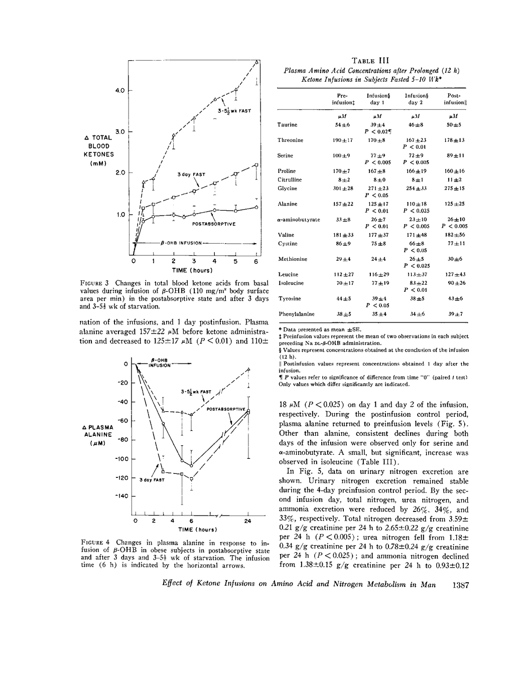 To evaluate the role of hyperketonemia in the hypoalaninemia and decreased protein catabolism of prolonged starvation, Na dl-beta-hydroxybutyrate was administered as a primed continuous 3-6-h infusion in nonobese subjects and in obese subjects in the postabsorptive state and after 3 days and 3-5 1/2 wk of starvation. An additional obese group received 12-h ketone infusions on 2 consecutive days after 5-10 wk of fasting. The ketone infusion in nonobese and obese subjects studied in the postabsorptive state resulted in total blood ketone acid levels of 1.1-1.2 mM, a 5-15 mg/100 ml decrease in plasma glucose, and unchanged levels of insulin, glucagon, lactate, and pyruvate. Plasma alanine fell by 21% (P smaller than 0.001) in 3 h. In contrast, other amino acids were stable or varied by less than 10%. Infusions lasting 6 h reduced plasma alanine by 37%, reaching levels comparable to those observed in prolonged starvation. Equimolar infusions of NaC1 and/or administration of NaHCO3 failed to alter plasma alanine levels. During prolonged fasting, plasma alanine, which had fallen by 40% below prefast levels, fell an additional 30% in response to the ketone infusion. In association with repeated prolonged (12 h) infusions in subjects fasted 5-10 wk, urinary nitrogen excretion fell by 30%, returning to base line after cessation of theinfusions and paralleling the changes in plasma alanine. Ketone infusins resulted in two- to fourfold greater increments in blood ketone acids in fasted as compared to postabsorptive subjects. It is concluded that increased blood ketone acid levels induced by infusions of Na DL-beta-hydroxybutyrate result in hypoalaninemia and in nitrogen conservation in starvation. These data suggest that hyperketonemia may be a contributory factor in the decreased availability or circulating alanine and reduction in protein catabolism characteristic of prolonged fastings9