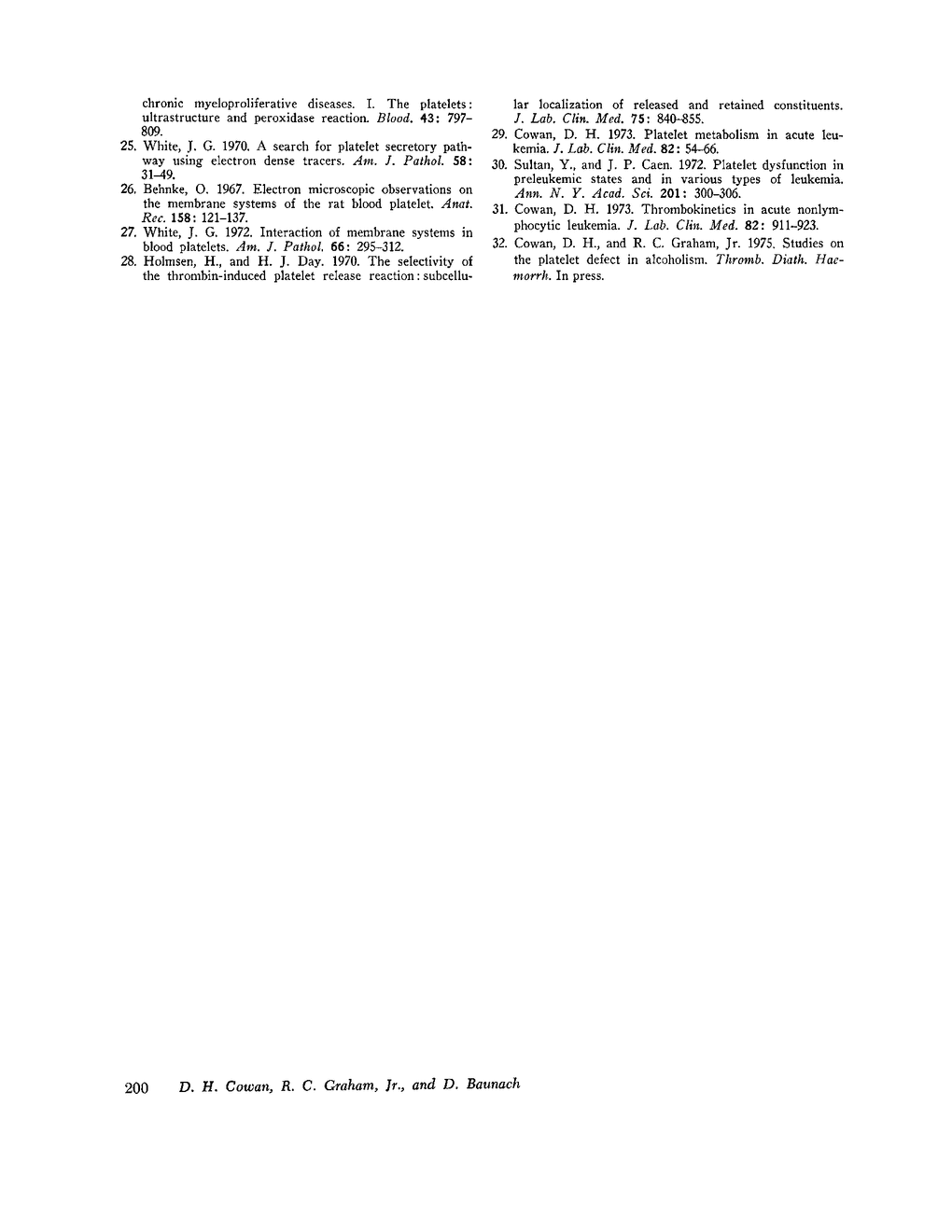 The ultrastructure and adenine nucleotide metabolism of platelets from patients with acute leukemia were studied to elucidate possible mechanisms for the platelet dysfunction observed in this clinical setting. Nonstimulated (resting) platelets from leukemic patients varied greatly in size; exhibited marked variation in the number of alpha granules present per cell; had poorly delineated circumferential bands of microtubules; and often grossly dilated open channel systems or cytoplasmic vacuolization. The intracellular concentrations of ATP and ADP were significantly below normal, and the specific radioactivity of ATP and ADP of nonstimulated platelets in leukemia was equivalent to or exceeded that seen in stimulated normal platelets. Addition of ADP or collagen to platelets from leukemic patients was followed by retarded and incomplete shape change, delayed and incomplete centripetal migration of subcellular organelles, impaired degranulation, and the formation of loose aggregates composed of relatively few platelets. Stimulation of "leukemic" platelets with collagen led to the release of significantly subnormal amounts of ATP and ADP and no significant change in the specific radioactivity of the intracellular nucleotides. In contrast to the results in normal platelets, the conversion of ATP to inosine monophosphate and hypoxanthine in platelets in leukemia failed to increase significantly with collagen stimulation. The results indicate that abnormalities exist in the storage pool of adenine nucleotides and the release mechanism of platelets in acute leukemia. These defects appear to contribute to an impairment in the release reaction in these platelets. Many of the ultrastructural and metabolic defects seen in acute leukemia occur in platelets in preleukemia.