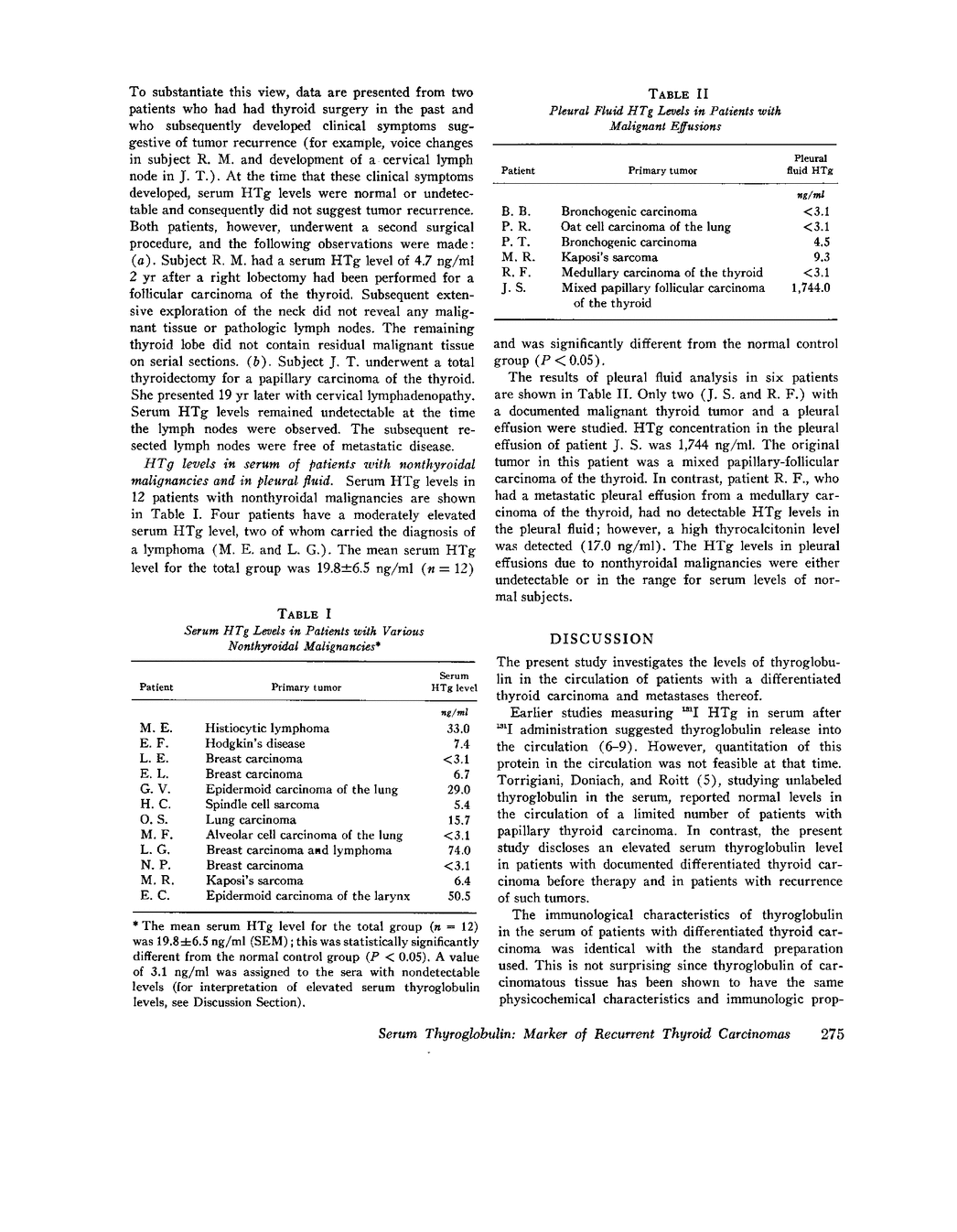 The presence of human thyroglobulin (HTg) in serum of patients was identical by immunological criteria to the serum standard used in the radioimmunoassay. The serum thyroglobulin levels in untreated patients with differentiated thyroid carcinoma ranged from 22.0 to 445.0 ng/ml with a mean of 144.3 +/- 46.5 ng/ml (SEM) (n = 10). The mean serum thyroglobulin measured postoperatively in seven of these patients was 6.4 +/- 1.5 ng/ml, not statistacally different from the mean level of 5.1 +/- 0.49 ng/ml (range 0-20.7 ng/ml) observed in 71 out of 95 control subjects with detectable HTg levels. By contrast serum HTg levels were normal or undetectable in subjects with medullary carcinoma of the thyroid. HTg levels were within normal limits in sera of patients who had previously undergone successful therapy for a differentiated thyroid carcinoma and in whom no metastases could be documented. The mean level for this group was 4.9 +/- 0.51 ng/ml (n = 43). In contrast, patients with documented metastases had a mean serum thyroglobulin level of 464.9 +/- 155.6 ng/ml (n = 6). The data support the thesis that in differentiated thyroid carcinoma serum thyroglobulin levels are elevated when metastases develop after initial treatment. It is proposed that the measurement of thyroglobulin in the serum represents a simple and valuable adjunct in the posttreatment follow-up of patients with differentiated thyroid cancer.