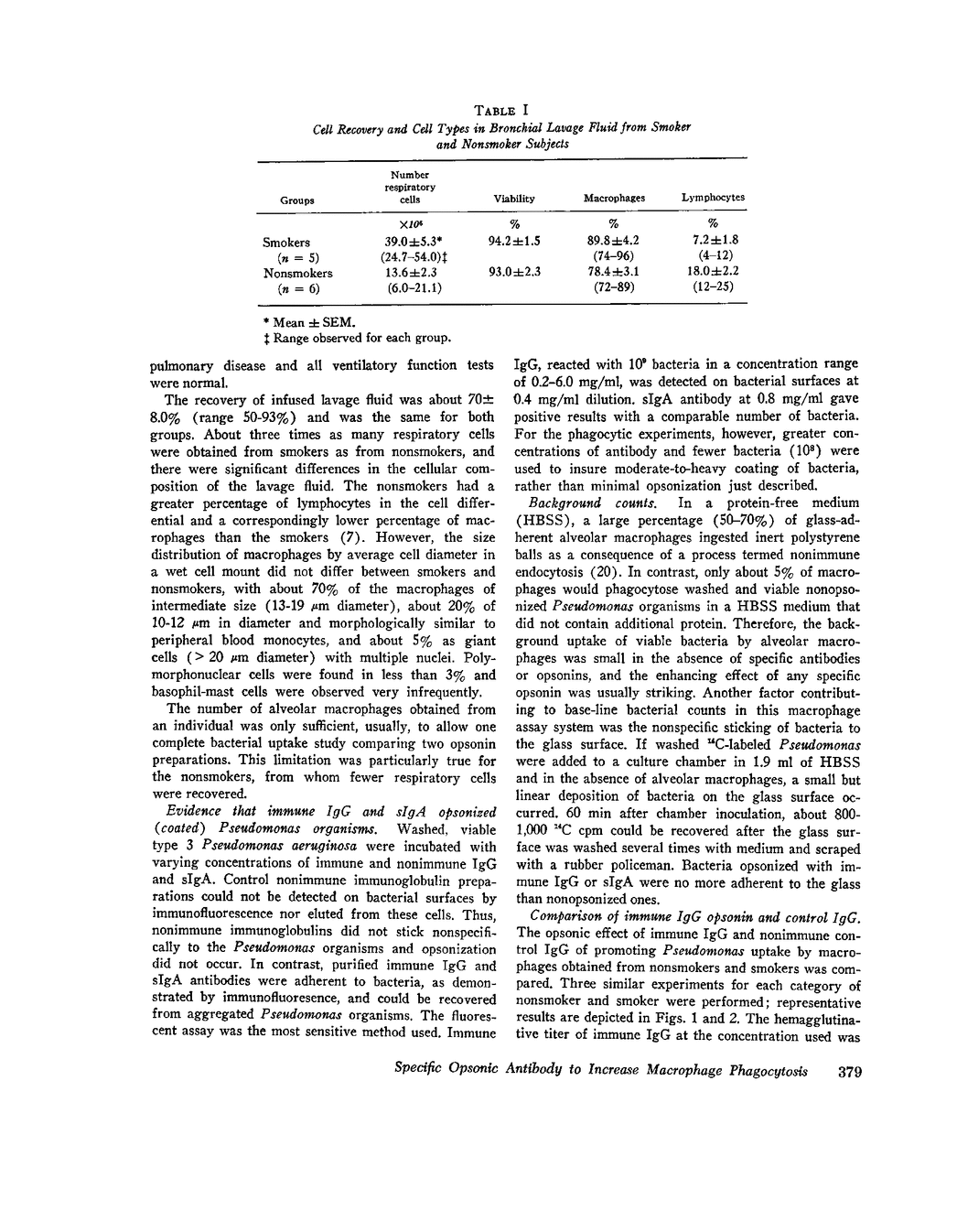 These studies compared the ability of specific secretory IgA (sIgA) and IgG antibodies to promote phagocytosis of viable pseudomonas aeruginosa by human alveolar macrophages. Macrophages were obtained by lung lavage of normal adult smoker and nonsmoker volunteers and were maintained as in vitro cell monolayers. Both immune sIgA and IgG agglutinating antibodies were demonstrated to coat and opsonize viable bacteria, whereas similar nonimmune immunoglobulin preparations did not. When alveolar macrophages were challenged with viable opsonized 14C-labeled Pseudomonas IgG-reacted bacteria were ingested better and killed more readily than sIgA-opsonized organisms. Phagocytic responses were not significantly different between macrophages obtained from smokers and nonsmokers. Although sIgA and IgG antibodies can be found in respiratory secretions and both are undoubtedly important in pulmonary host defense, IgG opsonic antibody was superior in enhancing the uptake of Pseudomonas by in vitro-cultured alveolar macrophages. It may be the more important respiratory antibody for certain bacterial infections.