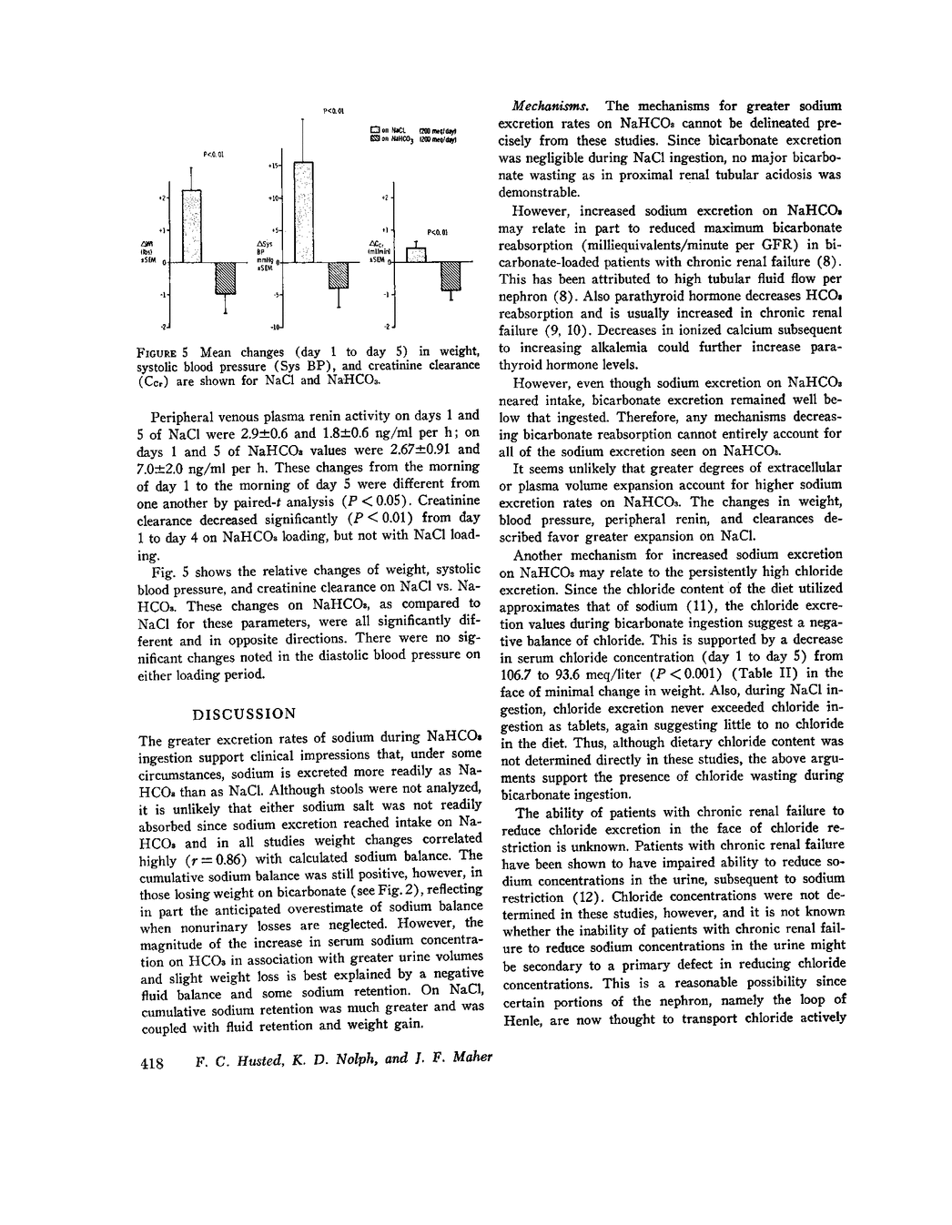 In patients with chronic renal failure, NaHCO3 therapy may correct or prevent acidemia. It has been proposed that the NaHCO3 required will not result in clinically significant Na retention comparable to that from similar increases in NaC1 intake. In each of ten patients with chronic renal failure, creatinine clearance (Ccr) range 2.5-16.8 ml/min, on an estimated 10-meq Na and C1 diet, electrolyte excretion was compared on NaHCO3 vs NaC1 supplements of 200 meq/day. Periods of NaHCO3 and NaC1 (in alternate order for successive patients) lasted 4 days, separated by reequilibration to base-line weight. Mean +/- SEM excretion (ex) of Na, C1, and HCO3 and deltaCcr and deltaweight (day 4-1) are compared below for the 4th day of NaC1 vs. NaHCO3 intake. Mean Ccr +/-SEM on day 4 of NaC1 and NaHCO3 were 10.8 +/-1.6 and 9.0 +/-1.4 ml/min, respectively (P less than 0.02). Mean systolic blood pressure (but not diastolic) increased significantly on NaC1 (P less than 0.05). No significant blood pressure changes were seen on NaHCO3. Net positive HCO3 balance occurred on NaHCO3 as indicated above and reflected a rise in mean serum HCO3 from 19 to 30 meq/liter (day 1 vs. 4) (P less than 0.01). Mechanisms for the greater excretion of Na on NaHCO3 may relate to C1 wasting as noted above on low C1 intake and limited HCO3 reabsorptive capacity. Thus, Na excretion by day 4 was greater on NaHCO3 than on NaHCO3 did Na excretion near intake (210 meq/day).