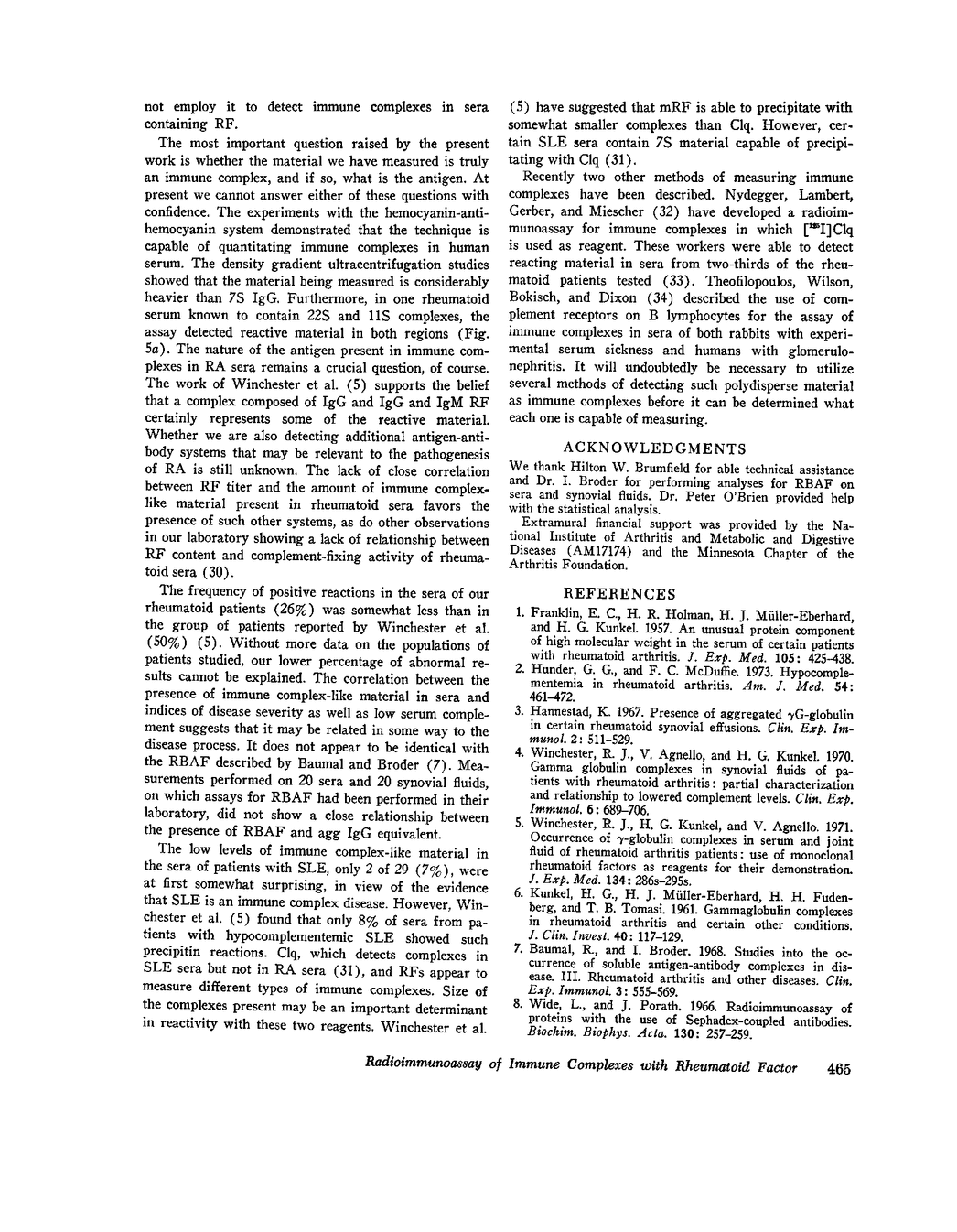 Evidence for the presence of immune complexes in blood, synovial fluid, and tisues of patients with rheumatoid arthritis (RA) includes low complement levels in blood and effusions, deposition of immunoreactants in tissues and vessel walls, precipitate formation after addition of monoclonal rheumatoid factor (mRF) to serum or synovial fluid. To quantitate immune complex-like material in RA patients, we developed a radioimmunoassay based on inhibition by test samples of the interaction of (125I)aggregated IgG (agg IgG) and mRF coupled to cellulose. This method could measure immune complexes of human antibody with hemocyanine prepared in vitro. The assay was not influenced by presence of polyclonal RF in test samples, nor by freezing and thawing. Normal levels of immune complex-like material in serum were less than 25 mug agg IgG EQ/ML. 12 of 51 RA sera examined (26%) contained more than 25 mug/ml. The presence of this material in RA sera was found to correlate with severity of disease, as measured by anatomical stage and functional class. There was an inverse correlation of the material with serum C4 level. Rheumatoid synovial fluids generally contained higher levels than serum, and five of 23 contained very much higher levels. The frequency of elevated levels of immune complex-like material in sera of patients with systemic lupus erythematosus (2 of 29) and with miscellaneous vasculitides (2 of 21 was much lower than in RA, suggesting that mRF exhibits a specificity for only certain kinds of immune complexes. The reason for this apparent specificity may explain such distinctive features of RA as the high frequency of polyclonal RF, the lack of immune complex nephritis, and the generally normal levels of serum complement.