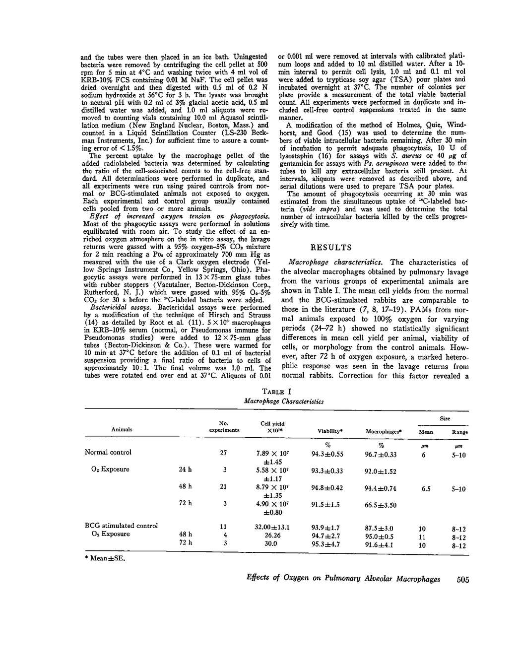 Bacterial infection may complicate pulmonary oxygen (O2) toxicity, and animals exposed to high O2 concentrations show depressed in vivo pulmonary bacterial inactivation. Therefore, in vitro studies were undertaken to define the mechanism by which O2 alters pulmonary antibacterial activity. Normal and BCG pretreated rabbits were exposed to 100% O2 for 24, 48, and 72-h periods. Pulmonary alveolar macrophages (PAM) were obtained from the experimental animals and from nonoxygen exposed controls by bronchopulmonary lavage. O2 exposure did not alter cell yield or morphology. PAMs were suspended in 10% serum-buffer, and phagocytosis of (14C)Staphylococcus aureus 502A and (14C)Pseudomonas aeruginosa was measured. Comparison of the precent uptake of the 14C-labeled S. aureus after a 60-min incubation period demonstrated that normal PAMs exposed to O2 for 48 h showed a statistically significant increase in phagocytosis when compared to their controls (43.5 vs. 29.2%). A similar, but smaller increase was seen after 24-h O2 exposures. 48 and 72-h O2 exposures produced no significant changes in phagocytosis in PAMs from BCG-stimulated rabbits. Normal PAMs also showed an increased phagocytosis of Ps. aeruginosa after 48-h oxygen exposure. No impairment of in vitro bactericidal activity against either S. aureus 502A or Ps. aeruginosa could be demonstrated in PAMs from normal rabbits exposed to O2 for 48 h. These results indicate that the in vitrophagocytic and bactericidal capacity of the rabbit PAM is relatively resistant to the toxic effects of oxygen, and that imparied in vivo activity may possibly be mediated by effects other than irreversible metabolic damage to these cells. The mechanism for the observed stimulation of phagocytosis remains to be determined.