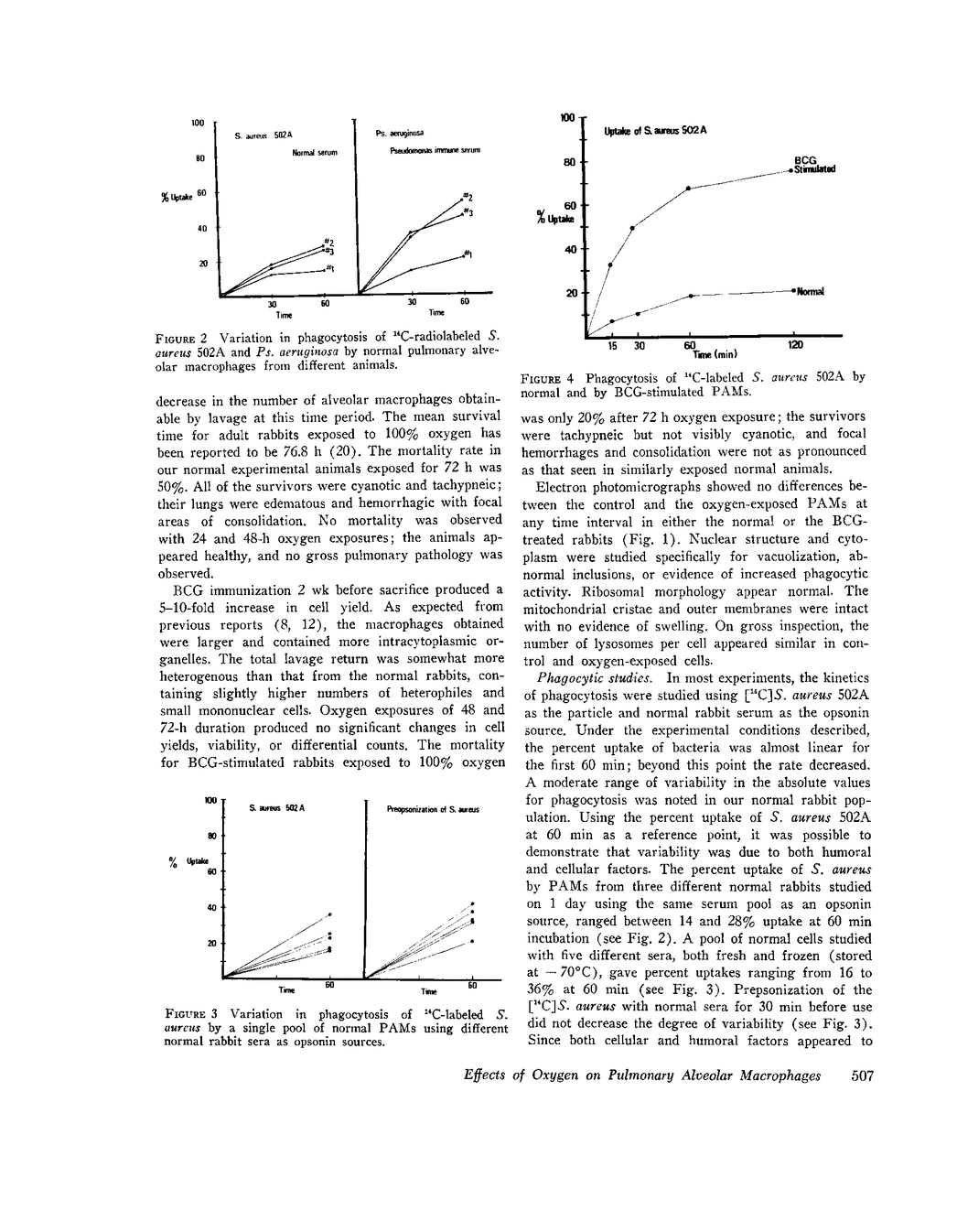 Bacterial infection may complicate pulmonary oxygen (O2) toxicity, and animals exposed to high O2 concentrations show depressed in vivo pulmonary bacterial inactivation. Therefore, in vitro studies were undertaken to define the mechanism by which O2 alters pulmonary antibacterial activity. Normal and BCG pretreated rabbits were exposed to 100% O2 for 24, 48, and 72-h periods. Pulmonary alveolar macrophages (PAM) were obtained from the experimental animals and from nonoxygen exposed controls by bronchopulmonary lavage. O2 exposure did not alter cell yield or morphology. PAMs were suspended in 10% serum-buffer, and phagocytosis of (14C)Staphylococcus aureus 502A and (14C)Pseudomonas aeruginosa was measured. Comparison of the precent uptake of the 14C-labeled S. aureus after a 60-min incubation period demonstrated that normal PAMs exposed to O2 for 48 h showed a statistically significant increase in phagocytosis when compared to their controls (43.5 vs. 29.2%). A similar, but smaller increase was seen after 24-h O2 exposures. 48 and 72-h O2 exposures produced no significant changes in phagocytosis in PAMs from BCG-stimulated rabbits. Normal PAMs also showed an increased phagocytosis of Ps. aeruginosa after 48-h oxygen exposure. No impairment of in vitro bactericidal activity against either S. aureus 502A or Ps. aeruginosa could be demonstrated in PAMs from normal rabbits exposed to O2 for 48 h. These results indicate that the in vitrophagocytic and bactericidal capacity of the rabbit PAM is relatively resistant to the toxic effects of oxygen, and that imparied in vivo activity may possibly be mediated by effects other than irreversible metabolic damage to these cells. The mechanism for the observed stimulation of phagocytosis remains to be determined.
