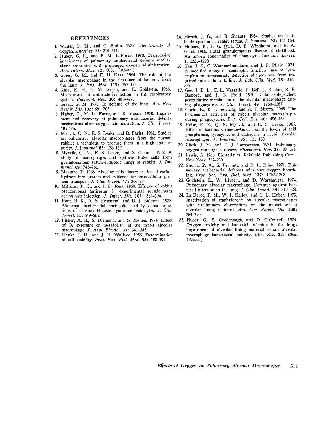 Bacterial infection may complicate pulmonary oxygen (O2) toxicity, and animals exposed to high O2 concentrations show depressed in vivo pulmonary bacterial inactivation. Therefore, in vitro studies were undertaken to define the mechanism by which O2 alters pulmonary antibacterial activity. Normal and BCG pretreated rabbits were exposed to 100% O2 for 24, 48, and 72-h periods. Pulmonary alveolar macrophages (PAM) were obtained from the experimental animals and from nonoxygen exposed controls by bronchopulmonary lavage. O2 exposure did not alter cell yield or morphology. PAMs were suspended in 10% serum-buffer, and phagocytosis of (14C)Staphylococcus aureus 502A and (14C)Pseudomonas aeruginosa was measured. Comparison of the precent uptake of the 14C-labeled S. aureus after a 60-min incubation period demonstrated that normal PAMs exposed to O2 for 48 h showed a statistically significant increase in phagocytosis when compared to their controls (43.5 vs. 29.2%). A similar, but smaller increase was seen after 24-h O2 exposures. 48 and 72-h O2 exposures produced no significant changes in phagocytosis in PAMs from BCG-stimulated rabbits. Normal PAMs also showed an increased phagocytosis of Ps. aeruginosa after 48-h oxygen exposure. No impairment of in vitro bactericidal activity against either S. aureus 502A or Ps. aeruginosa could be demonstrated in PAMs from normal rabbits exposed to O2 for 48 h. These results indicate that the in vitrophagocytic and bactericidal capacity of the rabbit PAM is relatively resistant to the toxic effects of oxygen, and that imparied in vivo activity may possibly be mediated by effects other than irreversible metabolic damage to these cells. The mechanism for the observed stimulation of phagocytosis remains to be determined.