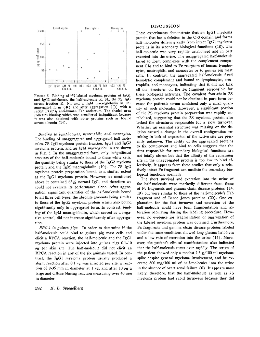 A human IgG1 myeloma protein that has a delection in the third constant domain of the heavy chain (Cgamma3) and forms two-chain half-molecules was studied for its in vivo turnover and its ability to fix C1q and hemolytic complement, to bind to human lymphocytes, neutrophils, and monocytes, and to induce a passive cutaneous reaction in guinea pigs. In both man and monkeys, the half-molecule was rapidly catabolized and in part excreted into the urine. The half-life in man was 4.3 days and the fractional turnover 165% per day; 7.6% of the intravascular pool was excreted into the urine per day. Although the 7S four-chain myeloma protein could not be obtained in a pure form, the elimination from the serum of a partially purified preparation suggested that it was also rapidly catabolized. The unaggregated half-molecule neither formed complexes with C1q, cound to human lymphocytes, neutrophils, and monocytes, nor elicited a reverse passive cutaneous reaction in guinea pigs. In contrast, the aggregated half-molecule fixed hemolytic complement and bound to the human white cells similarly to an intact IgG1 myeloma protein. In order to explain the biological activities of this half-moleculr, it is postulated that IgG1 may have several (at least two) submolecular sites for a given biological activity that are localized on both the Cgamma2 and Cgamma3 domains. Proteins having both sites would be capable of binding to C1q and Fc cell receptors in unaggregated in order to obtain half-molecule, must be aggregated in order to obtain this binding.