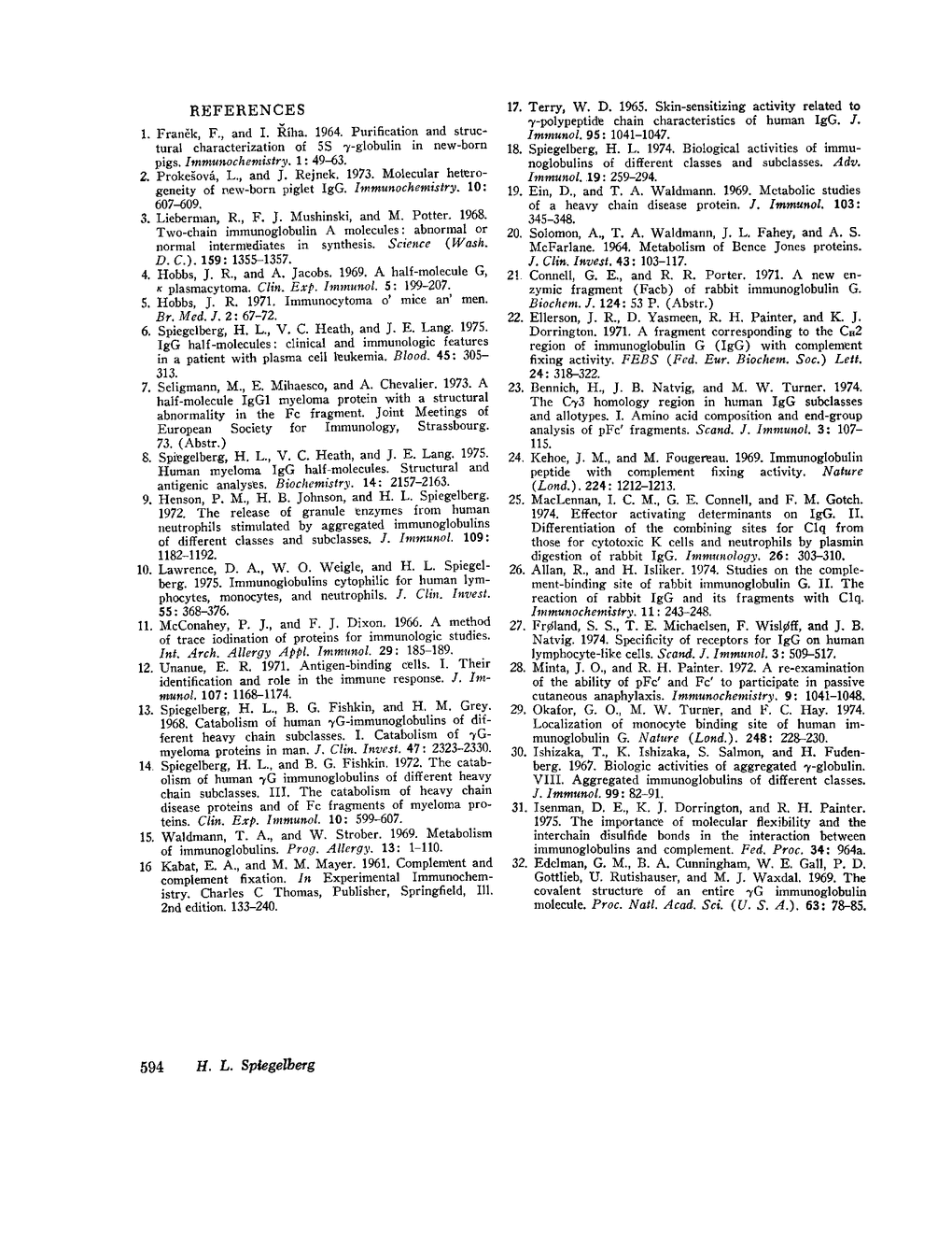A human IgG1 myeloma protein that has a delection in the third constant domain of the heavy chain (Cgamma3) and forms two-chain half-molecules was studied for its in vivo turnover and its ability to fix C1q and hemolytic complement, to bind to human lymphocytes, neutrophils, and monocytes, and to induce a passive cutaneous reaction in guinea pigs. In both man and monkeys, the half-molecule was rapidly catabolized and in part excreted into the urine. The half-life in man was 4.3 days and the fractional turnover 165% per day; 7.6% of the intravascular pool was excreted into the urine per day. Although the 7S four-chain myeloma protein could not be obtained in a pure form, the elimination from the serum of a partially purified preparation suggested that it was also rapidly catabolized. The unaggregated half-molecule neither formed complexes with C1q, cound to human lymphocytes, neutrophils, and monocytes, nor elicited a reverse passive cutaneous reaction in guinea pigs. In contrast, the aggregated half-molecule fixed hemolytic complement and bound to the human white cells similarly to an intact IgG1 myeloma protein. In order to explain the biological activities of this half-moleculr, it is postulated that IgG1 may have several (at least two) submolecular sites for a given biological activity that are localized on both the Cgamma2 and Cgamma3 domains. Proteins having both sites would be capable of binding to C1q and Fc cell receptors in unaggregated in order to obtain half-molecule, must be aggregated in order to obtain this binding.
