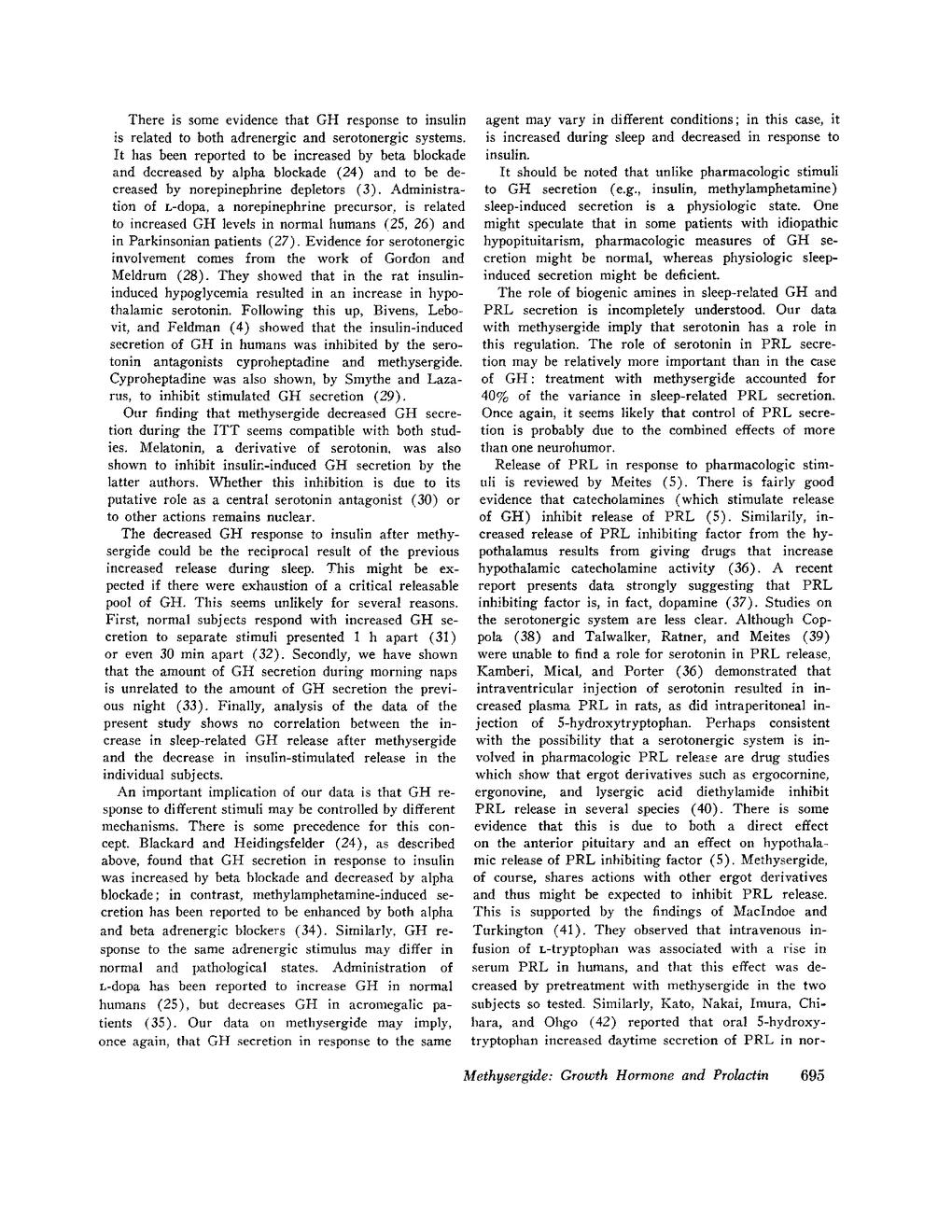 Methysergide, a clinically-used blocker of serotonin receptors, was administered to 10 normal young men at a dose of 2 mg every 6 h for 48 h. After drug treatment, serum levels of growth hormone during sleep were 41.9% higher than placebo values (less than 0.001). In contrast, drug treatment was associated with a 36.4% decrease in stimulated growth hormone secretion during insulin tolerance testing (P less than 0.01). These opposite effects of methysergide suggest that different mechanisms are responsible for sleep-related and insulin-induced growth hormone secretion. Accordingly, data obtained with pharmacologic stimuli may lead to erroneous inferences regarding physiologic growth hormone control mechanisms. Administration of methysergide profoundly suppressed sleep-related prolactin secretion; overall nocturnal mean prolactin fell by 70.3% from 4.30+/-0.19 to 1.28+/-0.06 ng/ml (P less than 0.0001). It appears that serotonin may be significant modulating neurotransmitter for the control of growth hormone secretion, limiting sleep-related release, and enhancing insulin-induced release. It seems likely from these data that the role of serotonin in the control of prolactin secretion is relatively more important, since serotonin receptor blockade dramatically reduced sleep-related prolactin secretion.