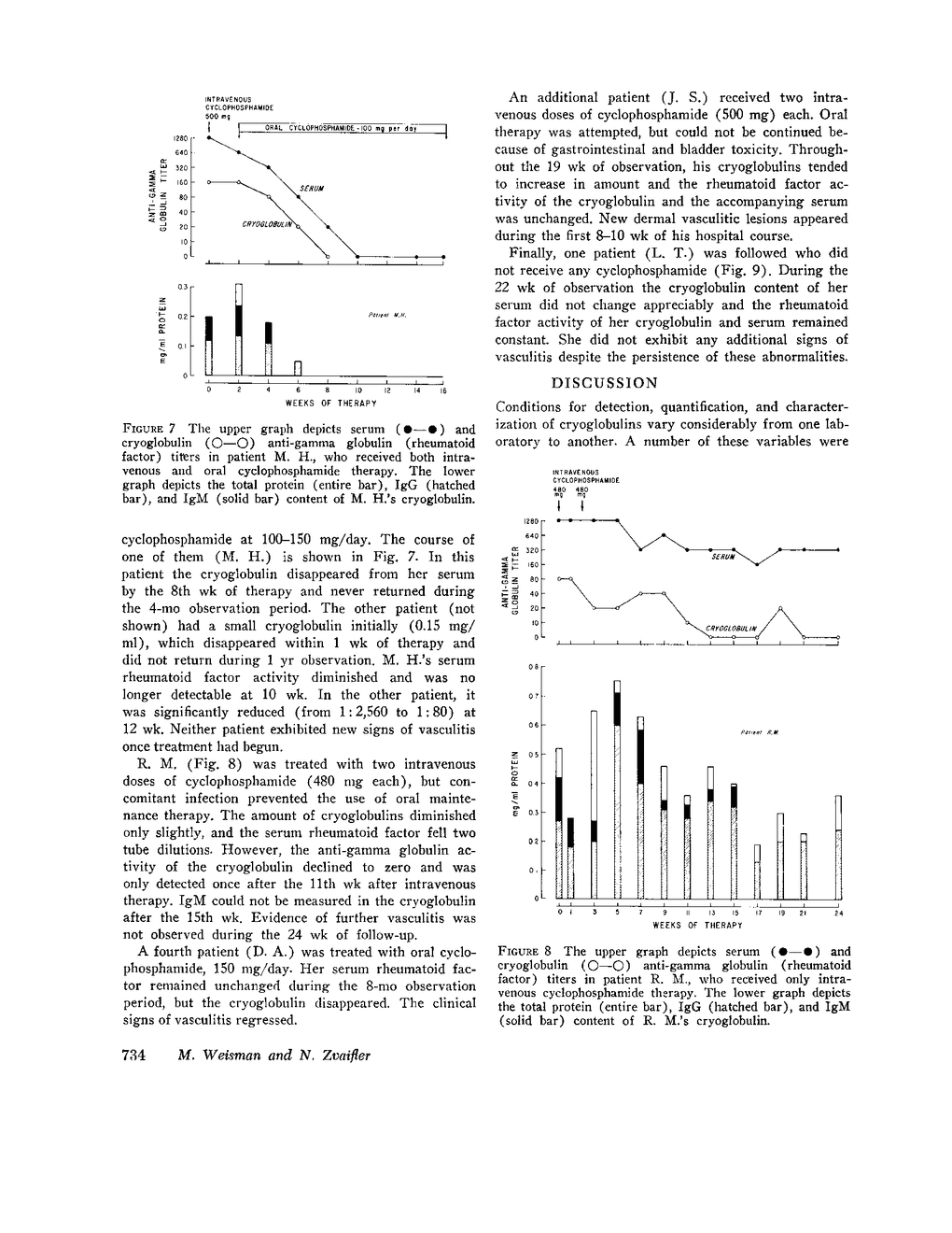 Cryogloculins were examined in a standardized manner in an unselected group of 35 patients with rheumatoid arthritis (RA) and 8 patients with RA complicated by cutaneous vasuclitis and neuropathy. Optimum conditions for detection and characterization of cryoglobulins were established; the proportion of resolubilized to total precipitable protein remained constant in an individual patient under these conditions. All 8 vascultis patients and 9 of 35 other patients with RA exhibited cryoglobulins; total protein and immunoglobin content were significantly higher in the cryoglobulins of patients with vasculitis. Immunoglobulins G and M constituted two-thirds and three-quarters of the total protein in the cryoglobulins from uncomplicated rheumatoid and vasculitis patients, respectively. Serum antiglobulin titers were higher, and serum C3 levels were lower, in vasculitis patients compared to rheumatoid patients without vasclitis. Anti-gamma globulin activity was detected in all cryoglobulins from vasculitis patients. Cryoglobulin IgG and IgM were polyclonal. Density gradient analyses demonstrated the majority of the cryoglobulin activity to reside in the 19S IgM fraction. There was no evidence of a light weight (8S) IgM. A monoclonal rheumatoid factor did not detect 7S-ANTI-7S complexes in the cryoprecipitates, but acid eluates from some cryoglobulins absorbed with insoluble IgG revealed an antiglobulin of the IgG class. Serial studies performed on vasculitis patients treated with cyclophosphamide disclosed a relationship between clinical evidence of vasculitis and the presence of cryoglobulins. The antigen (IgG) and antibody (largely IgM rheumatoid factor) nature of these cryglobulins is presented as evidence that the widespread vascular complications of RA are mediated, at least in part, by circulating immune complexes.
