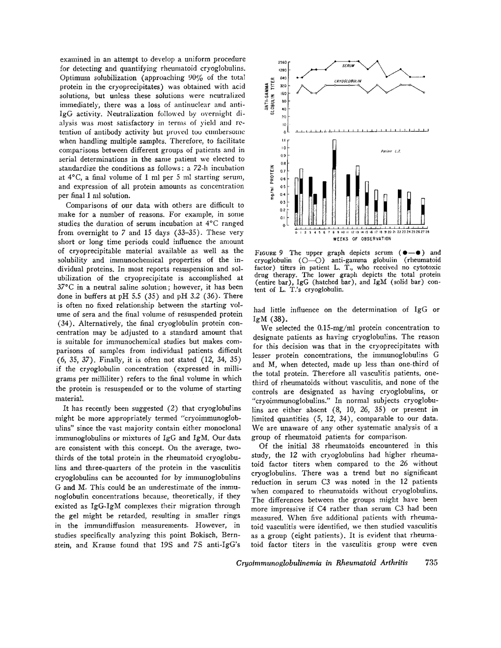 Cryogloculins were examined in a standardized manner in an unselected group of 35 patients with rheumatoid arthritis (RA) and 8 patients with RA complicated by cutaneous vasuclitis and neuropathy. Optimum conditions for detection and characterization of cryoglobulins were established; the proportion of resolubilized to total precipitable protein remained constant in an individual patient under these conditions. All 8 vascultis patients and 9 of 35 other patients with RA exhibited cryoglobulins; total protein and immunoglobin content were significantly higher in the cryoglobulins of patients with vasculitis. Immunoglobulins G and M constituted two-thirds and three-quarters of the total protein in the cryoglobulins from uncomplicated rheumatoid and vasculitis patients, respectively. Serum antiglobulin titers were higher, and serum C3 levels were lower, in vasculitis patients compared to rheumatoid patients without vasclitis. Anti-gamma globulin activity was detected in all cryoglobulins from vasculitis patients. Cryoglobulin IgG and IgM were polyclonal. Density gradient analyses demonstrated the majority of the cryoglobulin activity to reside in the 19S IgM fraction. There was no evidence of a light weight (8S) IgM. A monoclonal rheumatoid factor did not detect 7S-ANTI-7S complexes in the cryoprecipitates, but acid eluates from some cryoglobulins absorbed with insoluble IgG revealed an antiglobulin of the IgG class. Serial studies performed on vasculitis patients treated with cyclophosphamide disclosed a relationship between clinical evidence of vasculitis and the presence of cryoglobulins. The antigen (IgG) and antibody (largely IgM rheumatoid factor) nature of these cryglobulins is presented as evidence that the widespread vascular complications of RA are mediated, at least in part, by circulating immune complexes.