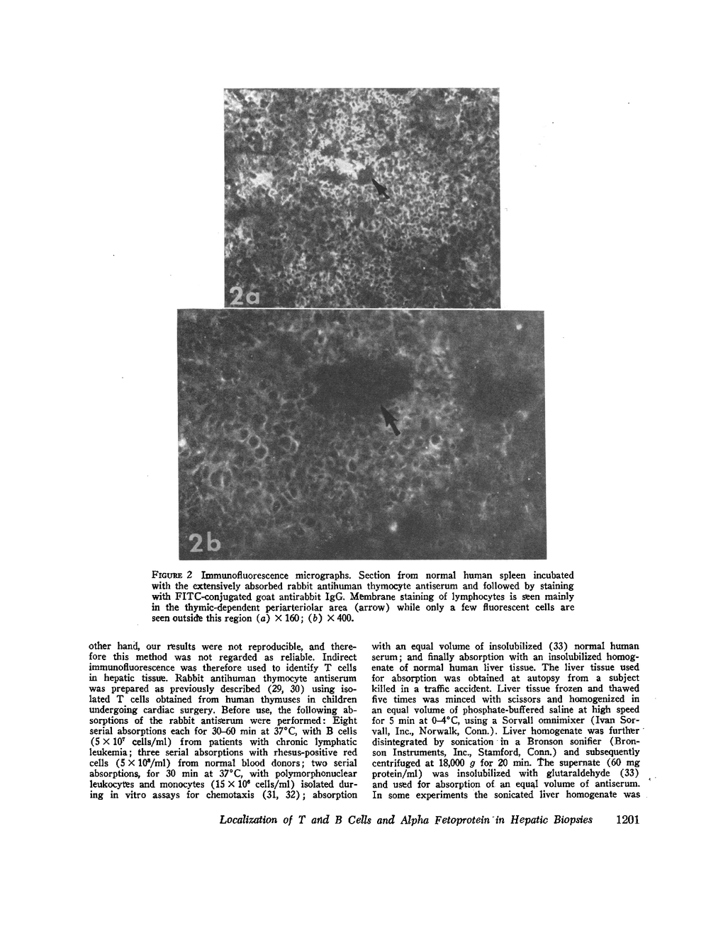 Peripheral blood and hepatic tissue T- and B-lymphocyte distributions, serum alpha fetoprotein (AFP) concentrations, and hepatic AFP were studied in 46 patients undergoing diagnostic percutaneous liver biopsy. The patients included 26 with alcoholic liver disease, 13 with nonalcoholic hepatitis or cirrhosis, and 7 with either normal histology or minor nonspecific changes. Serum AFP was determined by radioimmunoassay and hepatic tissue AFP by indirect immunofluorescence. Peripheral blood T lymphocytes were identified by the sheep red-cell rosette technique; and B lymphocytes by fluoresceinated anti-immunoglobulin antisera and IgG aggregates. Tissue identification of T lymphocytes was accomplished using an extensively absorbed rabbit antihuman thymocyte antiserum and indirect immunofluorescence; tissue B lymphocytes were identified using pepsin F (ab')2 fragments of rabbit IgG antibodies to human immunoglobulins. T lymphocytes predominanted in hepatic lymphoid infiltrates from patients with alcoholic liver disease (91+/-4%), whereas in patients with chronic active or chronic persistant hepatitis, viral hepatitis, or cryoptogenic cirrhosis proportions of T and B lymphocytic infiltrates were similar (50+/-15%). Hepatic tissue AFP was detected in 9 of 18 patients with alcoholic hepatitis; serum AFP concentration was increased in only 1 of these 9 patients. Tissue AFP was not observed in the remaining biopsy material nor were serum AFP concentrations increased. Peripheral blood T-cell numbers were significantly decreased in patients with alcoholic liver disease (P less than 0.01) and in nonalcoholic hepatitis or cirrhosis (P less than 0.025). A close relationship between peripheral blood T-lymphocytopenia and hepatic T-cell infiltrates was observed in patients with alcoholic liver disease; this relationship was less apparent in patients with nonalcoholic hepatitis or cirrhosis.