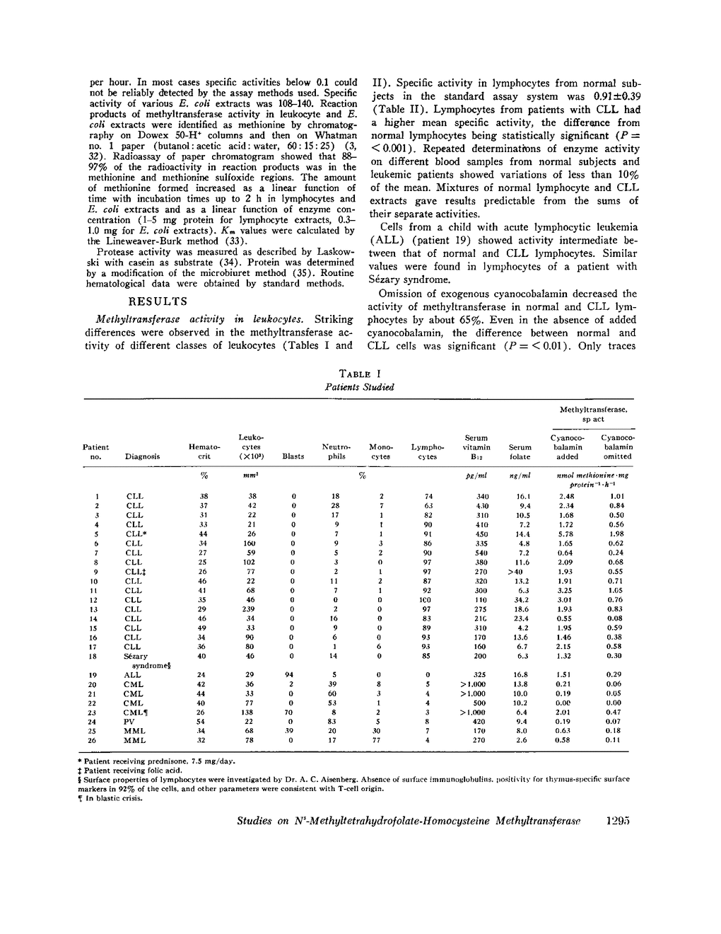 A cobalamin-dependent N5-methyltetra-hydrofolate-homocysteine methyltransferase (methyl-transferase) was demonstrated in unfractioned extracts of human normal and leukemia leukocytes. Activity was substantially reduced in the absence of an added cobalamin derivative. Presumably, this residual activity reflects the endogeneous level of holoenzyme. Enzyme activity was notably higher in lymphoid cells than in myeloid cells. Thus, mean specific activities (+/-SD) were: chronic lymphocytic leukemia lymphocytes, 2.15+/-1.16; normal lymphocytes, 0.91+/-0.59; normal mature granulocytes, 0.15+/-0.10; chronic myelocytic leukemia granulocytes, barely detectable activity. Properties of leukocytes enzymes resembled those of methyltransferases previously studied in bacteria and other animal cells. Granulocytes and chronic myelocytic leukemia cells contain a factor or factors that inhibits Escherichia coli enzyme. The data suggest that the prominence of this cobalamin-dependent enzyme in lymphocytes and other mononuclear cell types may be related to their potential for cell division.