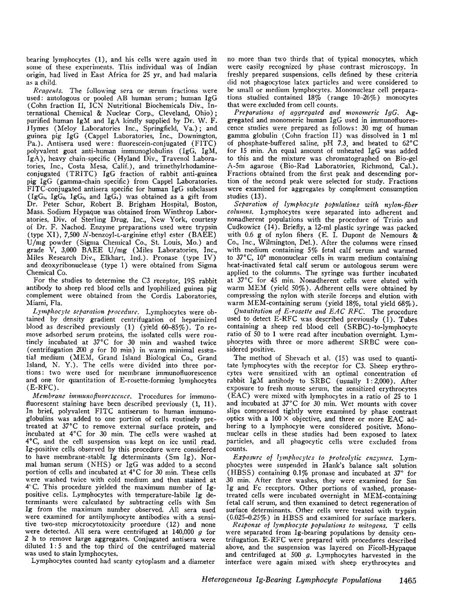 Two separate lymphocyte populations, each bearing easily detectable surface immunoglobulin, have been detected in human peripheral blood. The first, B cells, has surface determinants that are stable at 37degreeC, but are removed by pronase and regenerate in culture. The cells are nylon adherent and have a receptor for C3, and studies with unit gravity sedimentation indicate they are mostly small lymphocytes. B cells comprise 9.5% of the total lymphocytes, with the normal range from 3-16%. As many or more lymphocytes lack membrane-incorporated Ig determinants but have an Fc receptor that binds IgG1 and IgG3 in normal serum maximally at 4degreeC. This receptor for cytophilic IgG is removed by pronase but not by trypsin. The second population has been named L lymphocytes because of membrane-labile IgG determinants. L cells do not adhere to nylon, do not form rosettes with sheep erythrocytes sensitized with antibody and mouse complement, and are larger than small lymphocytes. These lymphocytes with cold-reactive Fc receptors for serum IgG do not form E-rosettes or respond to phytohemaggutinin. Since L cells do not have surface markers of T and B lymphocytes, it is likely that they comprise a separate population.