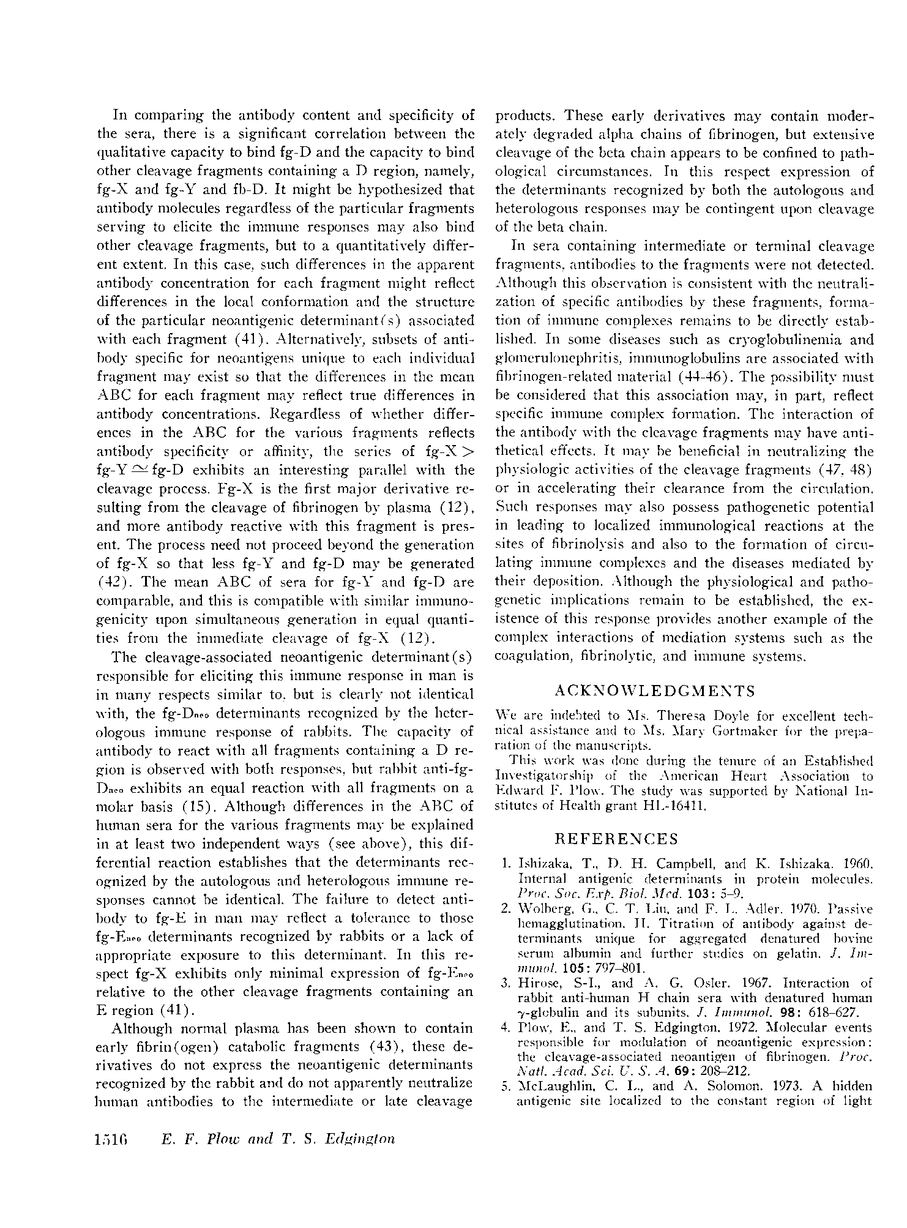 Cleavage of human fibrinogen and fibrin by plasmin is associated with modification of native antigenic expression and the exposure of cleavage-associated neoantigenic sites on the derivative molecular fragments. In this study, the presence of humoral antibodies in man to cleavage-associated neoantigens has been demonstrated by primary antigen binding radioimmunochemical assays. Specific binding of radioiodinated human fibrinogen D fragment by serum immunoglobulins was demonstrated in 52 of 59 random normal human sera and was independent of immunoglobulin concentration. Binding was mediated by F (ab)2 fragments of IgG, and specificity for neoantigens was indicated by the capacity of the D fragment but not native fibrinogen to competitively inhibit the antibody. The population distribution of antibody to these cleavage-associated neoantigens indicated the presence of a major group of individuals (77%) with a mean antigen binding capacity of 11.8 pmol/ml serum. Two minor populations with : (a) low or undetectable binding capacities (less than 6.0 pmol/ml serum) and (b) exhibiting markedly elevated binding capacities (less 18.0 pmol/ml serum) were delineated. Independent of these features, sera could also be readily separated into two groups that differed with respect to relative antibody affinity. The antibodies in most sera exhibited marked heterogeneity of binding affinity, whereas a small group of sera contained antibodies exhibiting relative homogeneity of binding affinity. Specific antibody was rather equally distributed between the major immunoglobulin classes, and in no serum was the antibody restricted to a single immunoglobulin class. Antibodies capable of binding fibrinogen fragments X, Y, and D and fibrin D fragment were detected in most sera. The quantity of antibody differed for different fragments with X greater than Y congruent to D greater than fibrin D. The presence of antibody capable of binding any single fragment was statistically correlated with the presence of antibody capable of binding other cleavage fragments. No antibody to the E fragment was detected. Antibody to cleavage fragments was not demonstrable in sera containing fibrinogen or fibrin cleavage fragments. Demonstration of this humoral immune response to the products of the fibrinolytic systems provides a new interface between the coagulation and immune system.