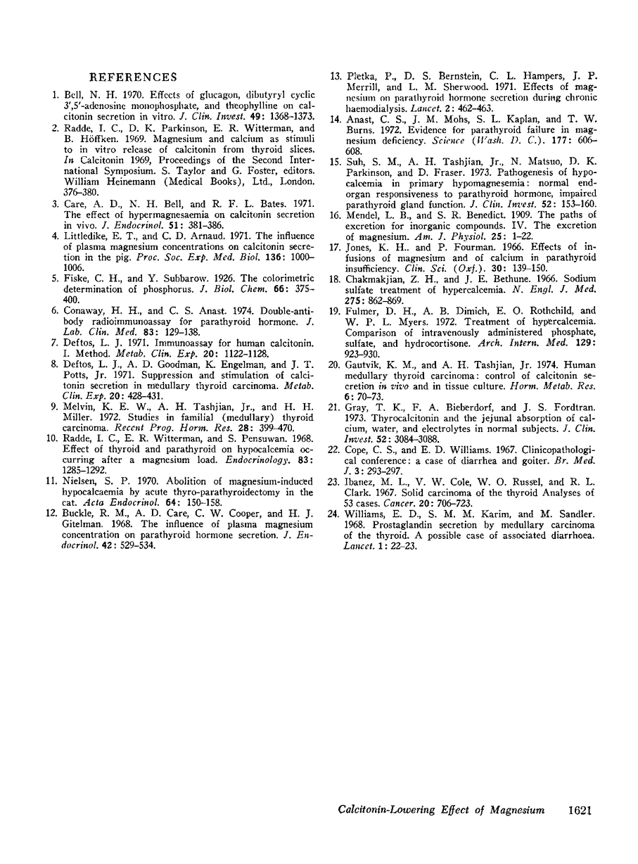 The effect of magnesium chloride or magnesium sulfate infusion on circulating levels of immunoreactive calcitonin (iCT) was evaluated on nine occasions in three patients with metastatic medullary carcinoma of the thyroid. One patient was normocalcemic and had normal circulating levels of immunoreactive parathyroid hormone (iPTH), one patient was hypocalcemic and had surgical hypoparathyroidism, and one patient had mild to moderate hypercalcemia associated with bone metastases. The basal serum iPTH levels were undetectable in the latter two patients. In every instance magnesium administration produced a rapid and striking fall in circulating iCT and usually a detectable fall in serum calcium. During the hypermagnesemic state, serum iPTH fell from normal to undetectable in the patient with normal parathyroid function, while serum iPTH levels remained undetectable in the hypoparathyroid patient and in the patient with hypercalcemia associated with bone metastases. The results of these studies indicate that: (a) contrary to what has been reported in normal experimental animals, magnesium administration lowers circulating iCT in human subjects with thyroid medullary carcinoma and (b) the calcium-lowering effect produced by magnesium in patients with medullary carcinoma may, in part at least, be due to a redistribution of body calcium that is not mediated by the actions of either parathyroid hormone or clacitonin.