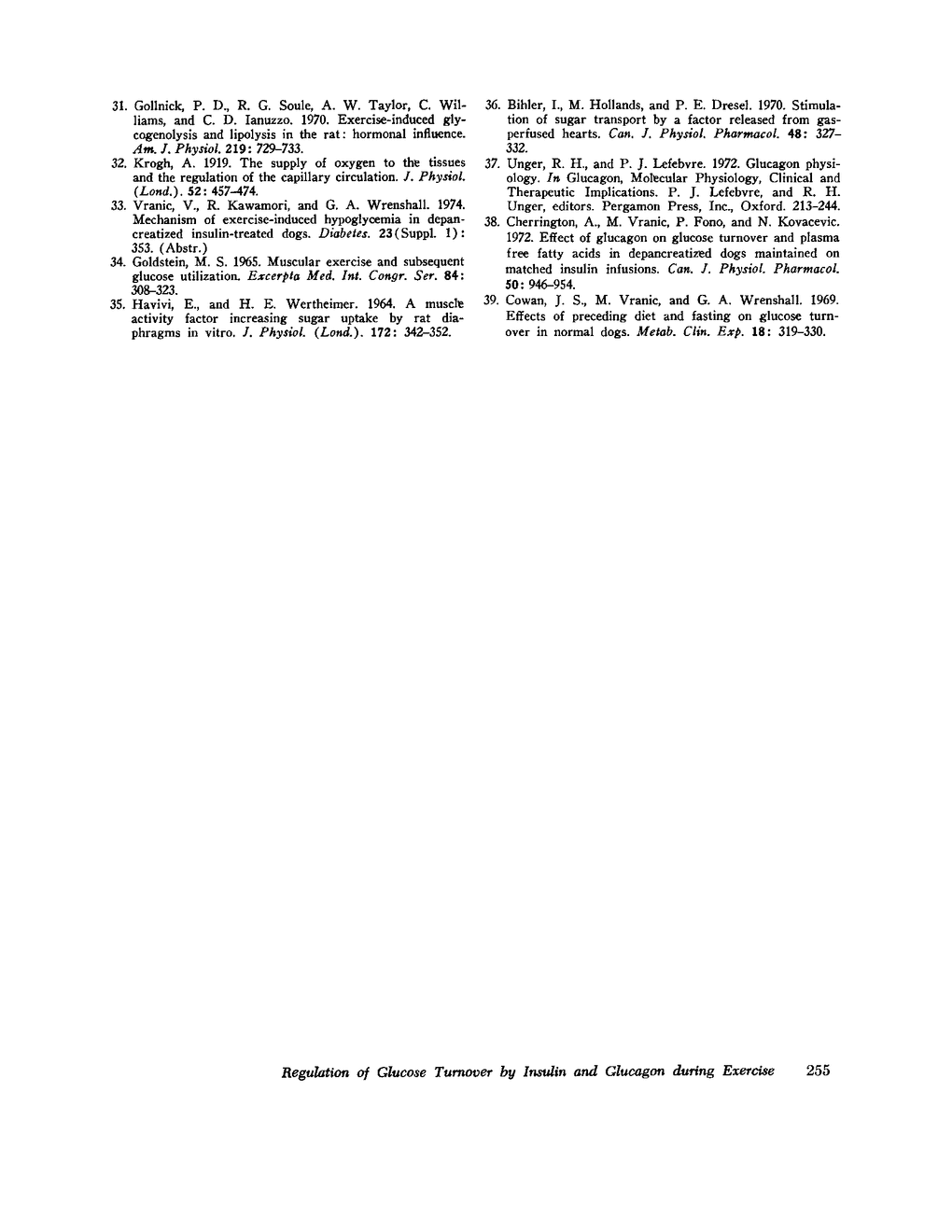 In order to elucidate the role of insulin and glucagon during strenuous exercise (100 m/min, slope 10-12 degrees), we have determined the rates of production (Ra), utilization (Rd), and metabolic clearance (M) of glucose in normal dogs before pancreatectomy and 2 wk after total pancreatectomy (a) when they were being maintained on constant intraportal basal insulin infusion, (245 muU/kg-min) and (b) when insulin supply had been withheld before and during exercise. Such an intense exercise induced in normal dogs a prompt decrease in mean immunoreactive serum insulin (IRI) from 20 +/- 3 to 11 +/- 2 muU/ml. In depancreatized insulin-infused dogs serum IRI during rest and exercise was between 14 +/- 1 and 12 +/- 2 muU/ml. In the third group, after cessation of insulin infusion, IRI decreased by 76% (from 17 +/- 5 to 4 +/- 1) and did not decrease futher during exercise. During exercise, serum immunoreactive glucagon (IRG) increased threefold in normal dogs. In depancreatized dogs serum IRG was the same as in normal resting dogs (indicating a nonpancreatic source of the hormone) but it did not increase during exercise. In normal dogs exercise induced proportional increases in Ra, Rd, and M (threefold) and normoglycemia was maintained. Changes in glucose turnover in depancreatized insulin-infused dogs were similar to those seen in normal dogs suggesting that a decrease in insulin secretion and a rise in IRG are not essential to prevent hypoglycemia in diabetic dogs. With the cessation of insulin infusion in resting depancreatized dogs, Ra increased, M decreased, and hyperglycemia ensued. During exercise, Ra continued to rise, but M did not increase significantly. Conclusions: (a) Regulation of glucose production by liver during exercise is multifactorial. A decrease in IRI and an increase in IRG are not the only factors which can promote delivery of glucose to the peripheral tissues. The insulin glucagon molar ratio was found not to be an essential metabolic functional unit in regulating glucose metabolism during exercise. (b) It is hypothesized that increases in blood flow and capillary surface area can lead to an increase in the amount of insulin delivered to the muscle even when serum levels of IRI are reduced during exercies. It is suggested that small, but adequate amounts of insulin (as found in normal and depancreatized insulin-infused dogs) are essential in regulating glucose uptake in the working muscle. (c) Since totally depancreatized dogs had normal serum levels of IRG (originating presumably from the gastrointestinal tract), the question of essentiality of basal glucagon activity in glucose homeostasis during exercise could not be resolved by these experiments. It appears, however, that regulation of secretion of nonpancreatic glucagon differs from that of pancreatic glucagon.
