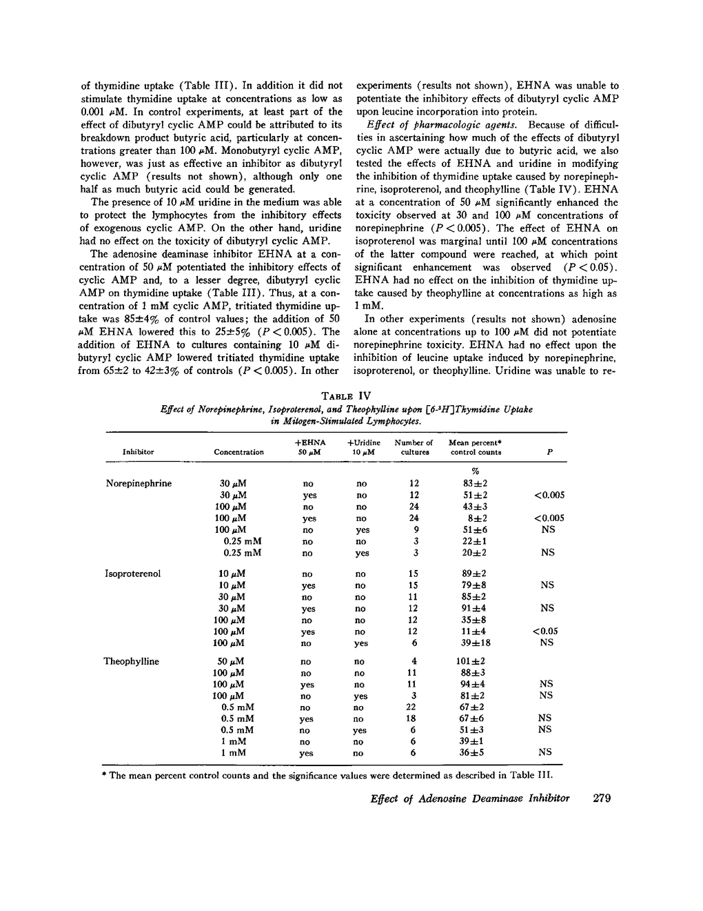 The biochemical mechanisms by which a genetically determined deficiency of adenosine deaminase leads to immunodeficiency are still poorly understood and prompted this study. We have examined the effects of the adenosine deaminase inhibitor erythro-9-(2-hydroxy-3-nonyl) adenine hydrochloride (EHNA) upon the response of human peripheral blood mononuclear cells to the mitogen concanavalin A (Con A). Cells isolated from normal volunteers were incubated in microtiter plates in the presence of various inhibitors, and the incorporation of tritrated thymidine or leucine into macromolecular material was measured after 64 h. EHNA at a concentration of 0.3 muM, which inhibited 90% of the adenosine deaminase (ADA) activity in a mononuclear preparation, impaired the incorporation of tritrated leucine into protein; 100 muM EHNA was the minimal concentration that inhibited thymidine uptake. The addition of 15 muM adenosine or 10 muM cyclic AMP to Con A-stimulated lymphocytes inhibited leucine uptake, while millimolar concentrations were required to inhibit thymidine uptake. Lower doses of adenosine and cyclic AMP stimulated thymidine incorporation. The inhibition of thymidine uptake observed with millimolar concentrations of adenosine was independent of the type of mitogen (pokeweed or Con A), the concentration of mitogen, or the medium used, but could be increased if the cells were cultured in a serum with reduced levels of adenosine deaminase. Washout experiments failed to demonstrate a critical period early in immune induction during which adenosine exerted its inhibitory effects. Noninhibitory doses of EHNA potentiated the effects of adenosine and cyclic AMP on leucine and thymidine uptake. EHNA at a concentration of 50 muM also potentiated the inhibitory effects on thymidine uptake of dibutyryl cyclic AMP, butyric acid, norepinephrine, and isoproterenol, but not theophylline. When mitogenesis was assayed by leucine incorporations, no synergy between EHNA and these compounds was apparent. Uridine relieved to some extent the inhibition of blastogenesis produced by adenosine and cyclic AMP, but not by dibutyryl cyclic AMP, norepinephreine, isoproterenol, or theophylline. Neither uridine alone nor uridine plus adenosine protected lymphocytes from the inhibitory effects of EHNA.