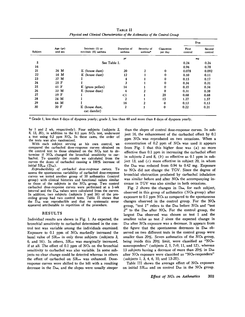Our purpose was to determine whether exposure to a realistic concentration of nitrogen dioxide (NO2) could increase the bronchial sensitivity of asthmatic patients to bronchoconstrictor agents. We established dose-response curves for changes in specific airway resistance (SRaw) in response to aerosolized carbachol in 20 asthmatics after each had spent 1 h in an exposure chamber breathing on one occasion unpolluted air and on a separate occasion 0.1 ppm NO2: sequence of exposures to unpolluted air and to low levels of NO2 were randomized in a single-blind fashion. NO2 induced a slight but significant increase in initial SRaw and enhanced the bronchoconstrictor effect of carbachol in 13 subjects: curves were shifted to the left and the mean dose of carbachol producing a twofold increase in initial SRaw was decreased from 0.66 mg to 0.36 mg (P less than 0.001). In contrast, NO2 neither modified the initial SRaw nor the bronchoconstrictor effect of carbachol in seven subjects. In 4 out of the 20 subjects, exposure to a higher concentration of NO2 (0.2 ppm) yielded variable results. Potentiation of the carbachol bronchoconstrictor response by NO2 could not be related to any physical or clinical characteristics of the subjects tested. Although the mechanisms underlying the NO2 effect remain controversial, the present results demonstrate that very low levels of NO2 can adversely affect some asthmatics.