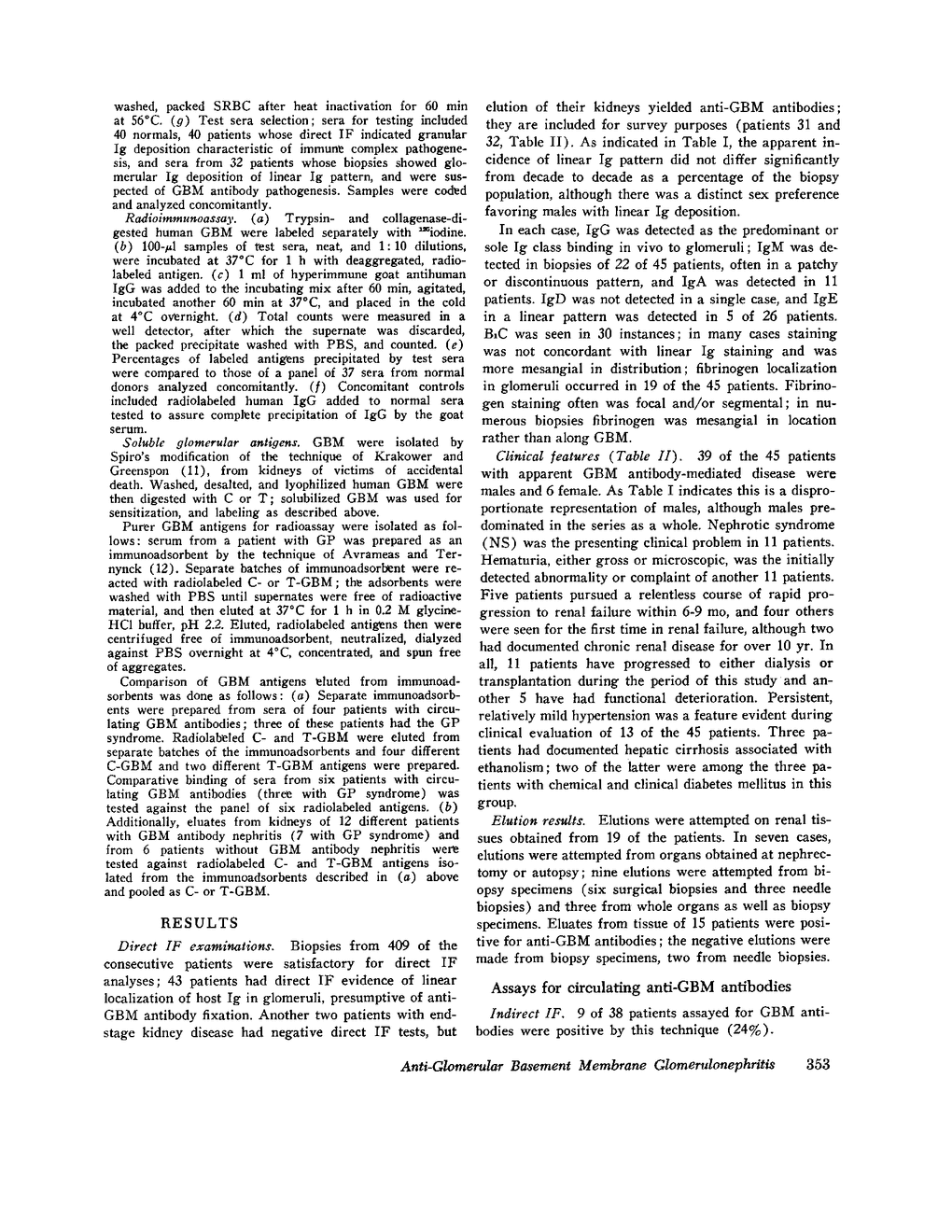 A prospective study was undertaken to establish the incidence of glomerular basement membrane (GBM) antibody-mediated glomerulonephritis and its histopathological characteristics in a clinical group of patients presenting with renal disease. Biopsies from 43 of 409 consecutive patients technically satisfactory for direct immunofluorescent (IF) examination had diffuse and generalized linear localization of host immunoglobulin (Ig); two other badly scarred kidneys tested negative to IF although GBM antibodies were eluted. Confirmatory evidence of GBM antibody-mediated disease in these patients came from whole kidney or biopsy elutions (15 patients), serologic assays for circulating GBM antibodies by indirect IF (9 of 38 patients), radioimmunoassay (26 of 34), and hemagglutination (31 of 32). Although sera were not tested from six patients, circulating antibodies were demonstrated by some test in 36 of 39 of the remainder. Histologically, half of the patients had minor and nonspecific glomerular abnormalities or mild focal proliferative glomerulonephritis. More severely involved kidneys had focal necrotizing (17%), rapidly progressive (7%), and chronic, usually sclerosing, glomerulonephritis (27%). Clinical courses of these patients comparably were quite variable, ranging from indolent microhematuria and/or gross hematuric bouts to progressive renal failure; nephrotic syndrome was observed in 11 patients. GBM antibody-mediated glomerulonephritis may be a relatively mild disease with apparently stable renal function, although 16 patients have experienced functional deterioration, and 11 have progressed to dialysis, renal transplantation, or death.