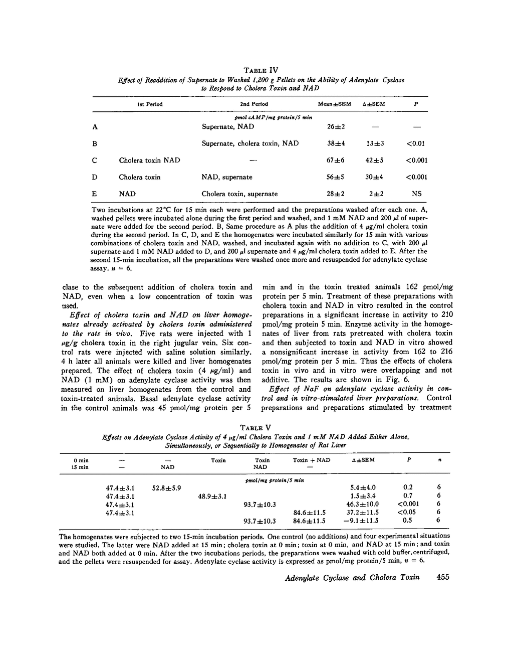 The effect of cholera toxin on adenylate cyclase from rat liver has been studied in a broken cell preparation. The activation of the enzyme in this in vitro preparation requires the addition of nicotinamide adenine dinucleotide (NAD) to the incubation medium and the presence of cell components other than the membrane-bound adenylate cyclase. Once the activation of the cyclase is produced, the effect persists despite repeated washing or solubilization of the enzyme. The effect can be obtained with concentrations of cholera toxin as low as 0.4 nM after 15 min of incubation at 22 degrees C, and stimulation can be detected after only 5 min of incubation at 37 degrees C. The activation of the enzyme is still apparent after at least 2 h at 0 degrees C. Preincubation with choleragenoid in vitro does not interfere with this effect of the toxin. Animals pretreated by an intravenous injection of cholera toxin do not respond to the in vitro addition of cholera toxin and NAD to the same extent as untreated animals; i.e., the effects overlap to suggest that the in vitro effect is the same as that in vivo. Responses to isoproterenol, glucagon, and NaF were also similar in the in vitro broken cell-activated system, as previously reported for the enzyme activated in vivo.